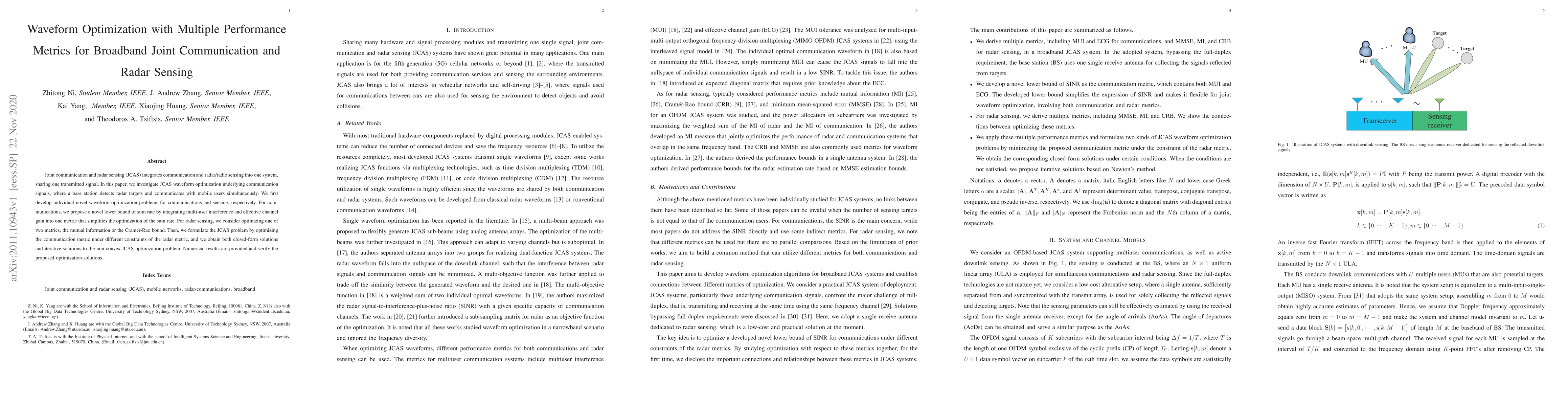 This paper develops waveform optimization techniques for joint communication and radar sensing (JCAS) systems, proposing novel optimization problems for both communication and radar metrics. It provides closed-form and iterative solutions to the non-convex optimization problem, demonstrating effective performance through numerical results.