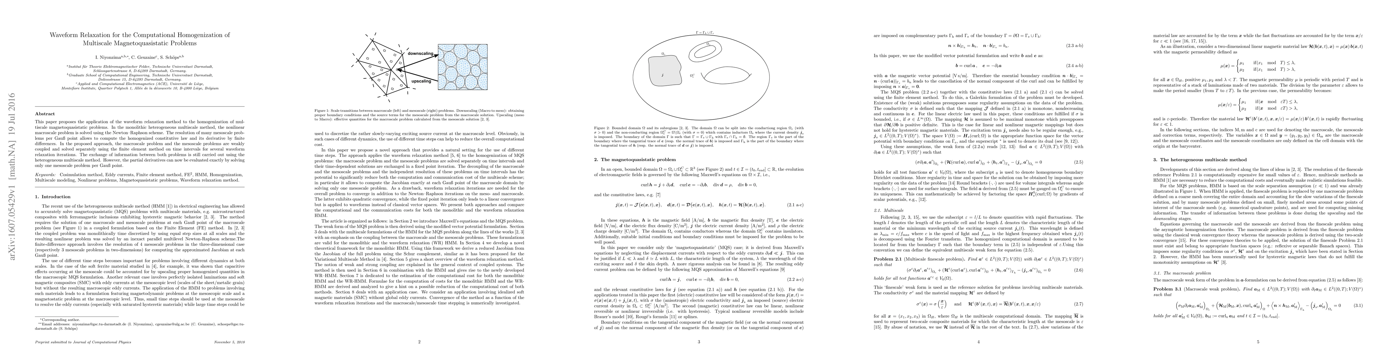 This paper introduces waveform relaxation for solving multiscale magnetoquasistatic problems, employing a finite element method to separately solve macroscale and mesoscale problems iteratively. The method enhances the computation of the homogenized constitutive law by evaluating partial derivatives more accurately through fewer mesoscale problem resolutions.