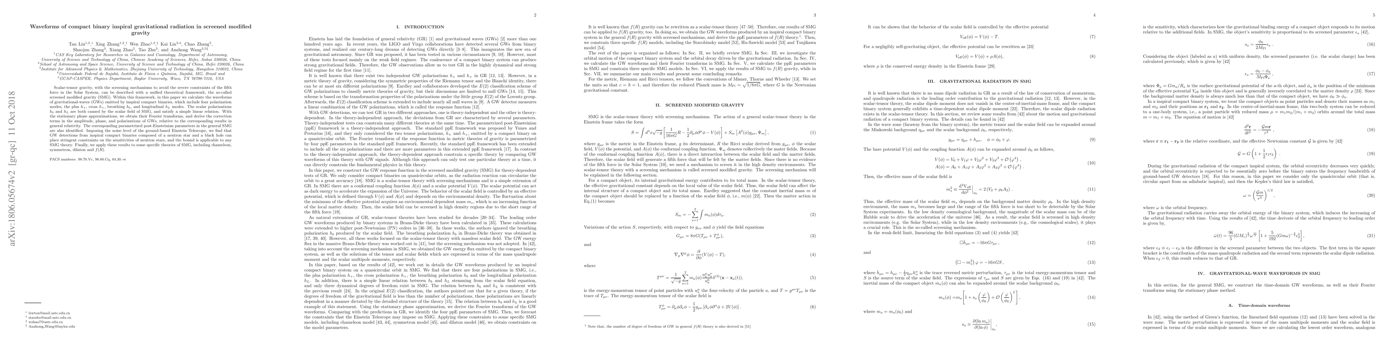 This paper calculates the gravitational wave (GW) waveforms from inspiral compact binaries in screened modified gravity (SMG), identifying four polarization modes and deriving correction terms relative to general relativity. It finds that GW detections can constrain SMG theories, applying these results to specific models like chameleon, symmetron, dilaton, and $f(R)$.