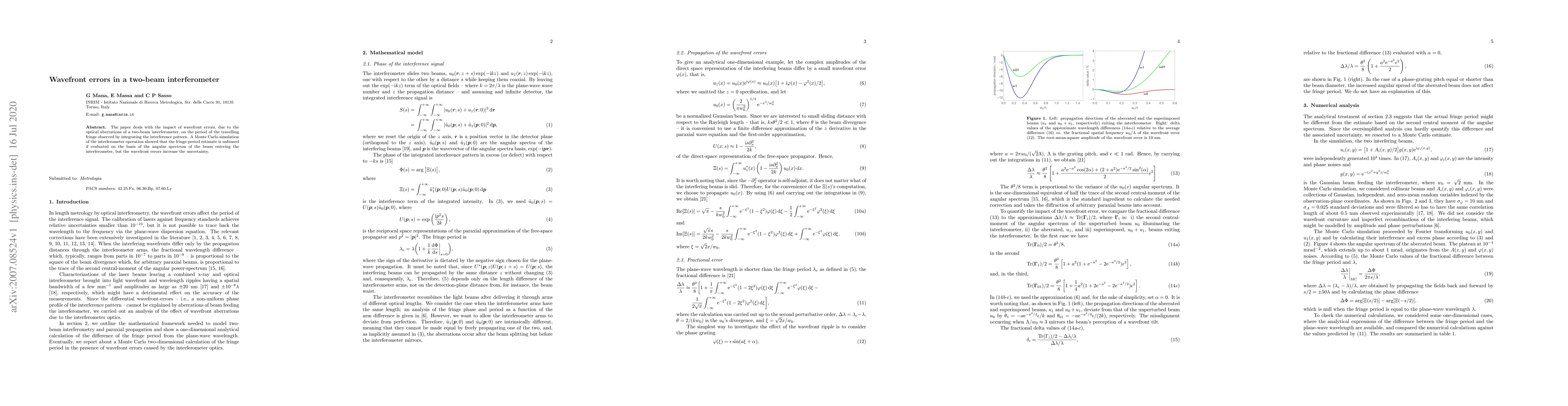 The paper deals with the impact of wavefront errors, due to the optical aberrations of a two-beam interferometer, on the period of the travelling fringe observed by integrating the interference pattern. A Monte Carlo simulation of the interferometer operation showed that the fringe-period estimate is unbiased if evaluated on the basis of the angular spectrum of the beam entering the interferometer, but the wavefront errors increase the uncertainty.