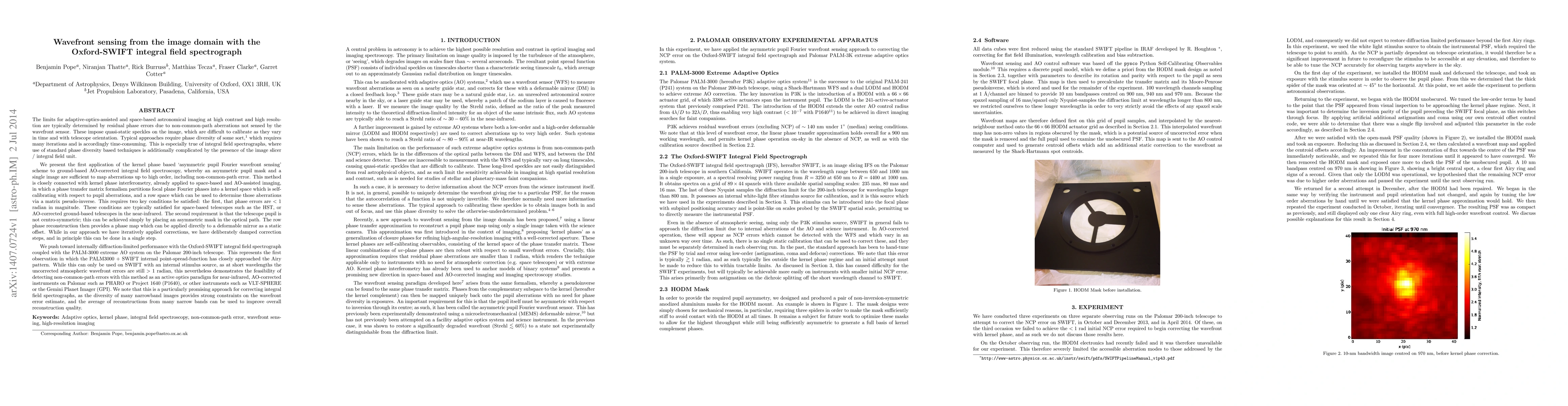 This paper presents a novel wavefront sensing technique using kernel phase-based methods applied to adaptive optics imaging with the Oxford-SWIFT spectrograph, achieving near diffraction-limited performance. The method effectively maps high-order aberrations using an asymmetric pupil mask and a single image, demonstrating its potential for integral field spectrographs and near-infrared AO-corrected instruments.
