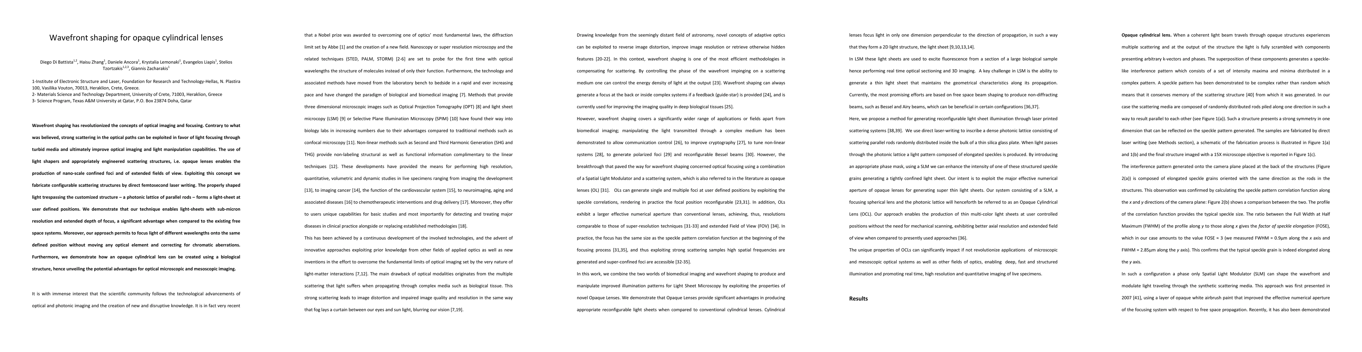 Wavefront shaping has revolutionized the concepts of optical imaging and focusing. Contrary to what was believed, strong scattering in the optical paths can be exploited in favor of light focusing through turbid media and ultimately improve optical imaging and light manipulation capabilities. The use of light shapers and appropriately engineered scattering structures, i.e. opaque lenses enables the production of nano-scale confined foci and of extended fields of view. Exploiting this concept we fabricate configurable scattering structures by direct femtosecond laser writing. The properly shaped light trespassing the customized structure, a photonic lattice of parallel rods, forms a light-sheet at user defined positions. We demonstrate that our technique enables light-sheets with sub-micron resolution and extended depth of focus, a significant advantage when compared to the existing free space systems. Moreover, our approach permits to focus light of different wavelengths onto the same defined position without moving any optical element and correcting for chromatic aberrations. Furthermore, we demonstrate how an opaque cylindrical lens can be created using a biological structure, hence unveiling the potential advantages for optical microscopic and mesoscopic imaging.