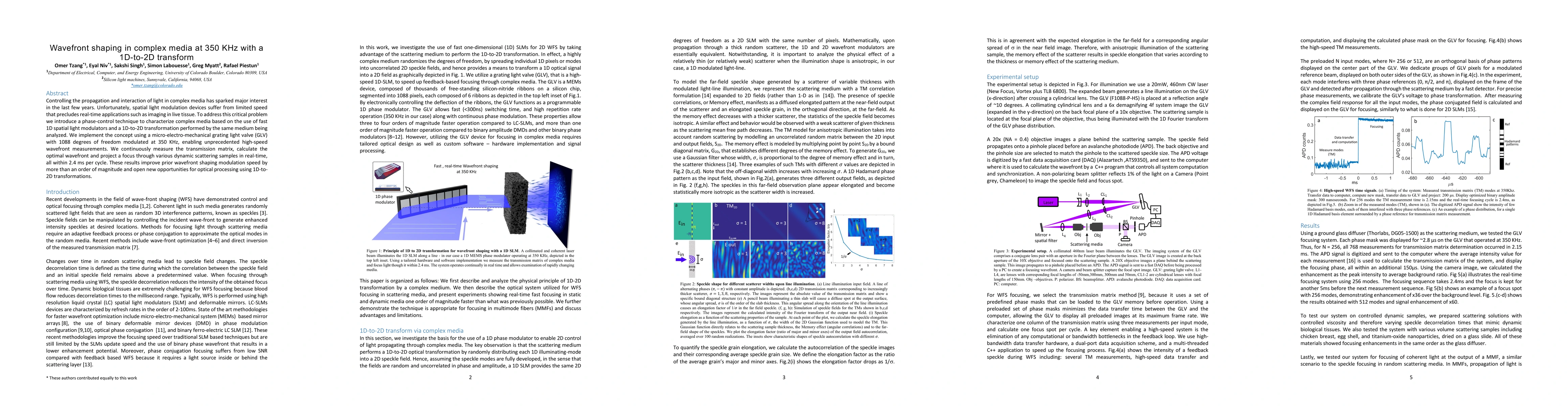 This research introduces a high-speed wavefront shaping technique utilizing fast 1D spatial light modulators and a 1D-to-2D transformation for real-time imaging in complex media, achieving modulation speeds over an order of magnitude faster than prior methods. The method employs a micro-electro-mechanical grating light valve to measure and shape wavefronts within 2.4 ms per cycle.
