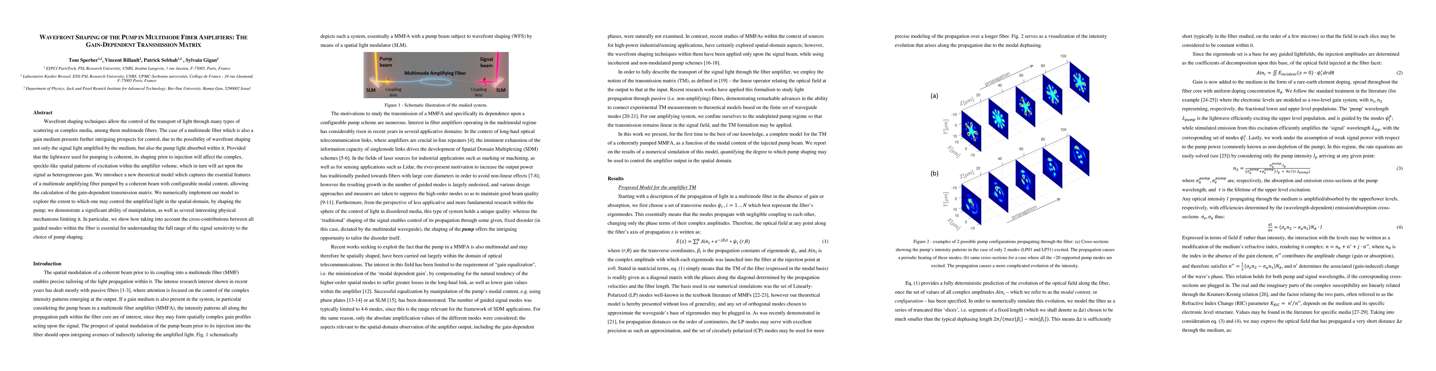 This paper introduces a theoretical model for controlling light transport in multimode fiber amplifiers via wavefront shaping of the coherent pump light. It demonstrates the ability to manipulate amplified signal light through shaping the pump, highlighting the importance of considering cross-contributions between all guided modes for understanding signal sensitivity.