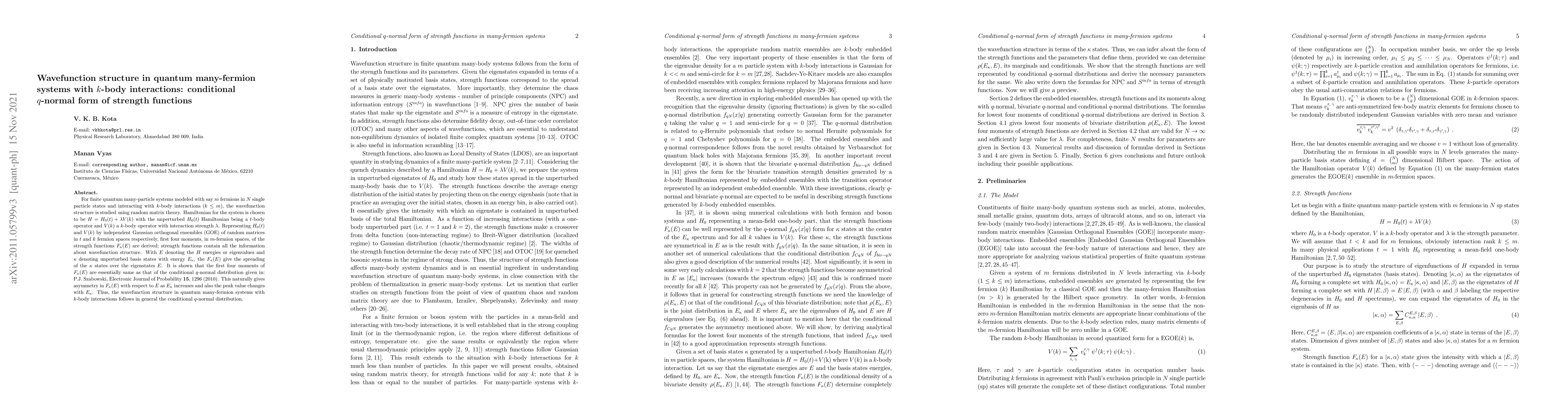 This research derives the wavefunction structure of quantum many-fermion systems with k-body interactions using random matrix theory. It shows that the first four moments of strength functions follow the conditional q-normal distribution, indicating asymmetry and changing peak values as the unperturbed state energy increases.