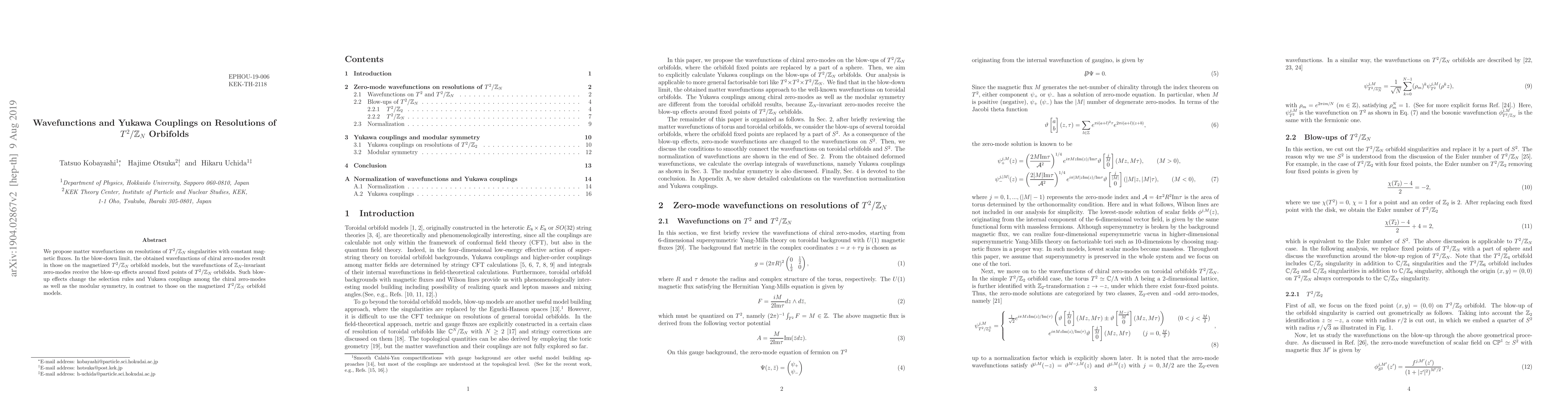 The paper presents detailed wavefunction expressions on resolutions of T2/ZN orbifolds, including normalization factors and Yukawa couplings, demonstrating how blow-up effects modify selection rules and modular symmetries.