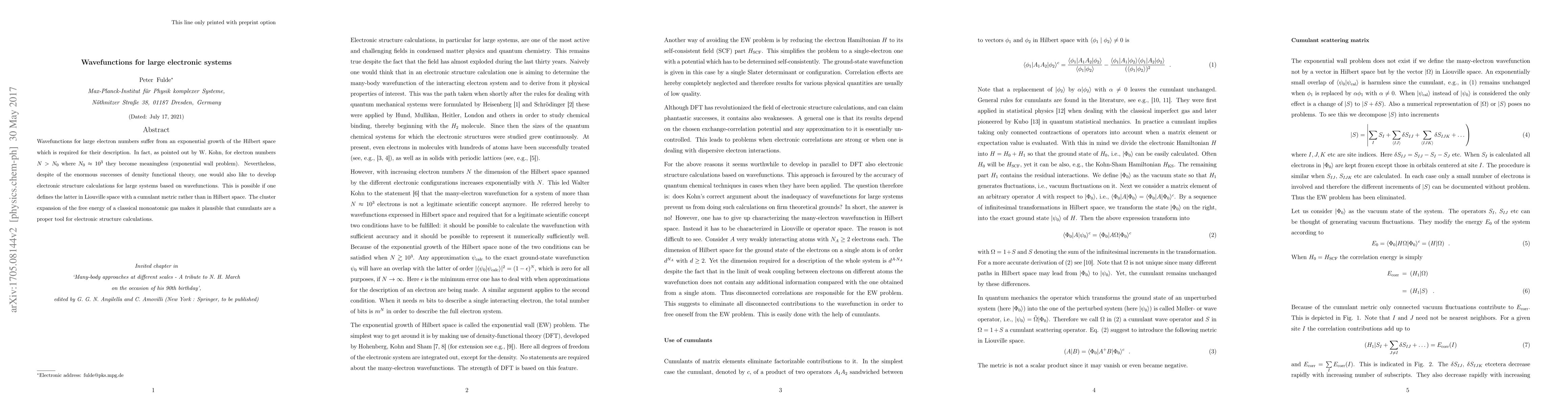 Wavefunctions for large electron numbers suffer from an exponential growth of the Hilbert space which is required for their description. In fact, as pointed out by W. Kohn, for electron numbers $N > N_0$ where $N_0 \approx 10^3$ they become meaningless (exponential wall problem). Nevertheless, despite of the enormous successes of density functional theory, one would also like to develop electronic structure calculations for large systems based on wavefunctions. This is possible if one defines the latter in Liouville space with a cumulant metric rather than in Hilbert space. The cluster expansion of the free energy of a classical monoatomic gas makes it plausible that cumulants are a proper tool for electronic structure calculations.