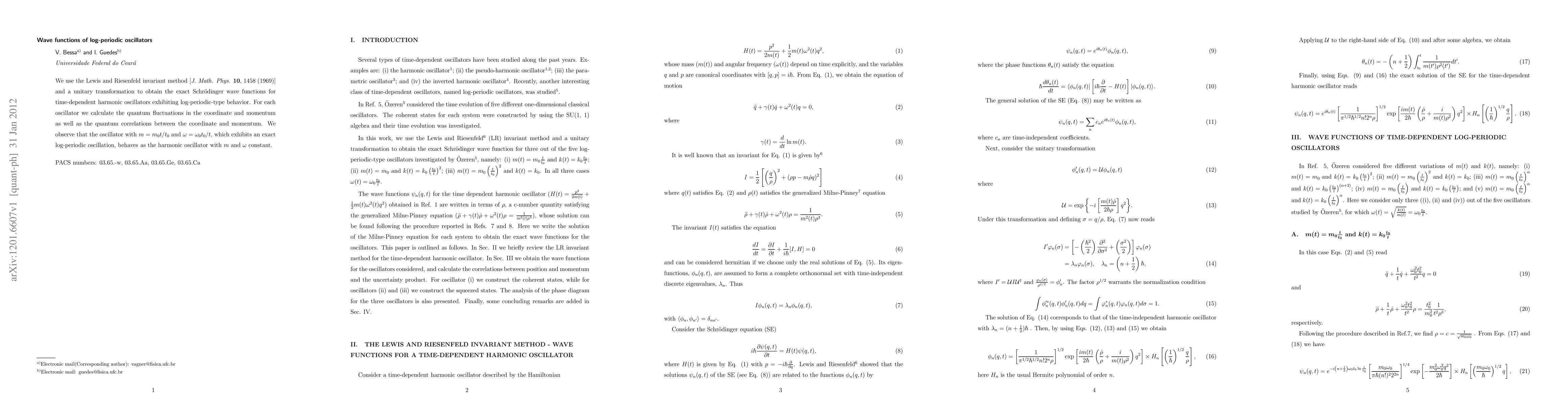 This paper derives the exact Schrödinger wave functions for time-dependent harmonic oscillators with log-periodic behavior using the Lewis and Riesenfeld invariant method. It examines quantum fluctuations and correlations, revealing that a specific log-periodic oscillator behaves similarly to a constant-frequency harmonic oscillator.
