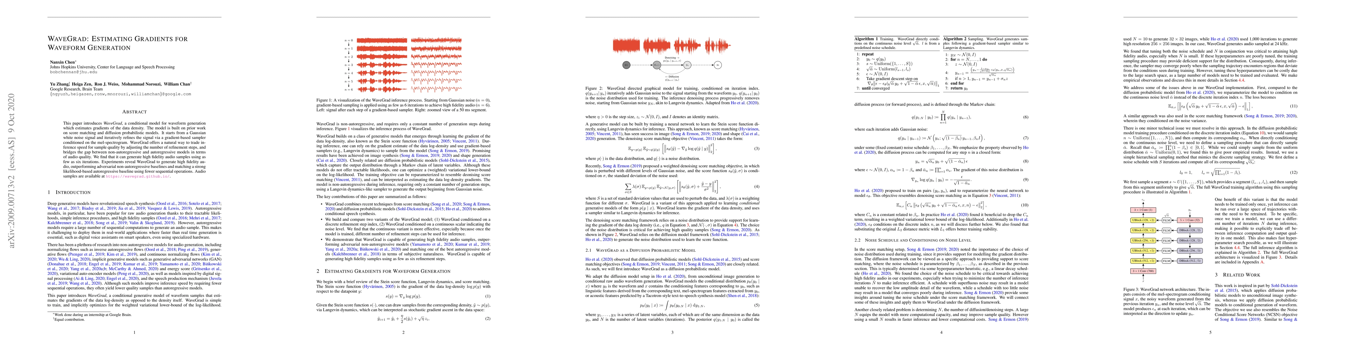 WaveGrad is a conditional model for waveform generation that estimates gradients to refine Gaussian white noise into high-fidelity audio using a gradient-based sampler. It outperforms non-autoregressive baselines and matches autoregressive models in audio quality with fewer operations.