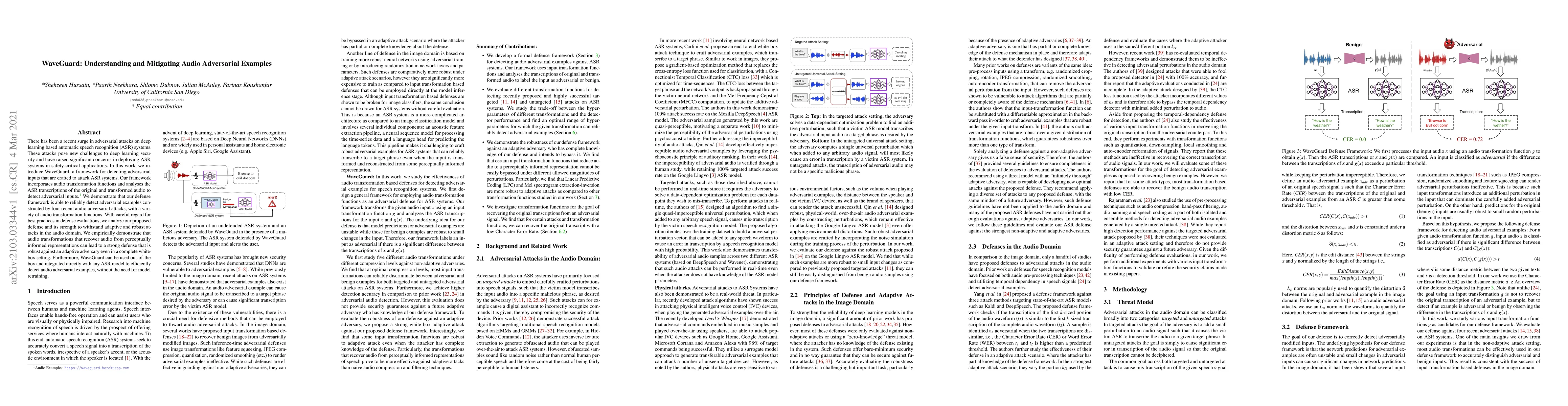 WaveGuard is a framework for detecting adversarial attacks on automatic speech recognition systems by analyzing audio transformations and transcriptions. It effectively identifies various adversarial examples and demonstrates robust defense against adaptive attacks, requiring no model retraining.