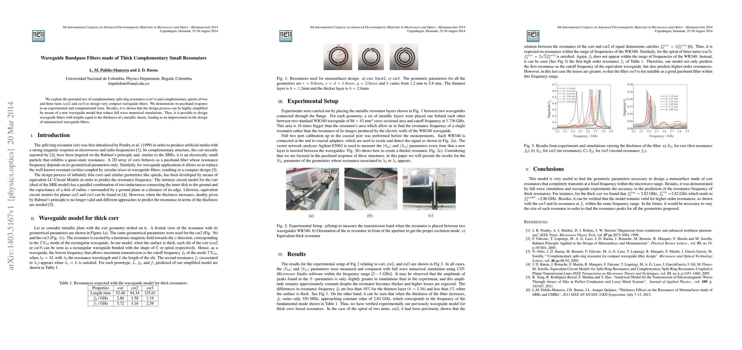 This paper investigates the use of thick complementary split ring resonators and spirals to design compact waveguide bandpass filters, demonstrating their passband response experimentally and computationally. A new waveguide model simplifies the design process, enabling the creation of miniaturized filters with lengths comparable to the thickness of metallic sheets.