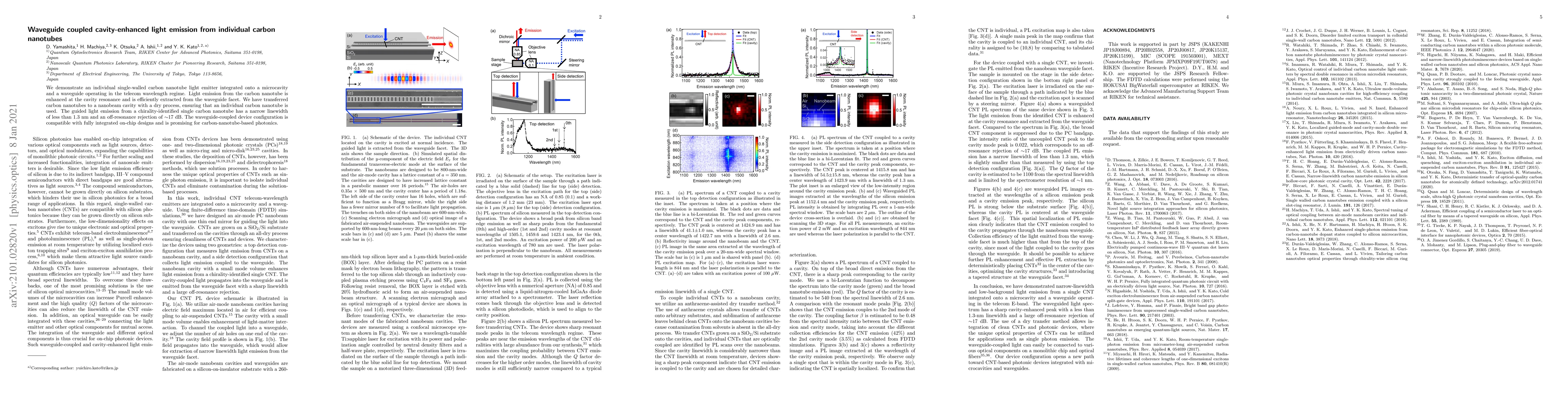 This research demonstrates a single-walled carbon nanotube light emitter integrated into a microcavity and waveguide, showing enhanced and efficient extraction of telecom wavelength light. The device exhibits narrow linewidth and high off-resonance rejection, suggesting potential for integrated photonic applications.