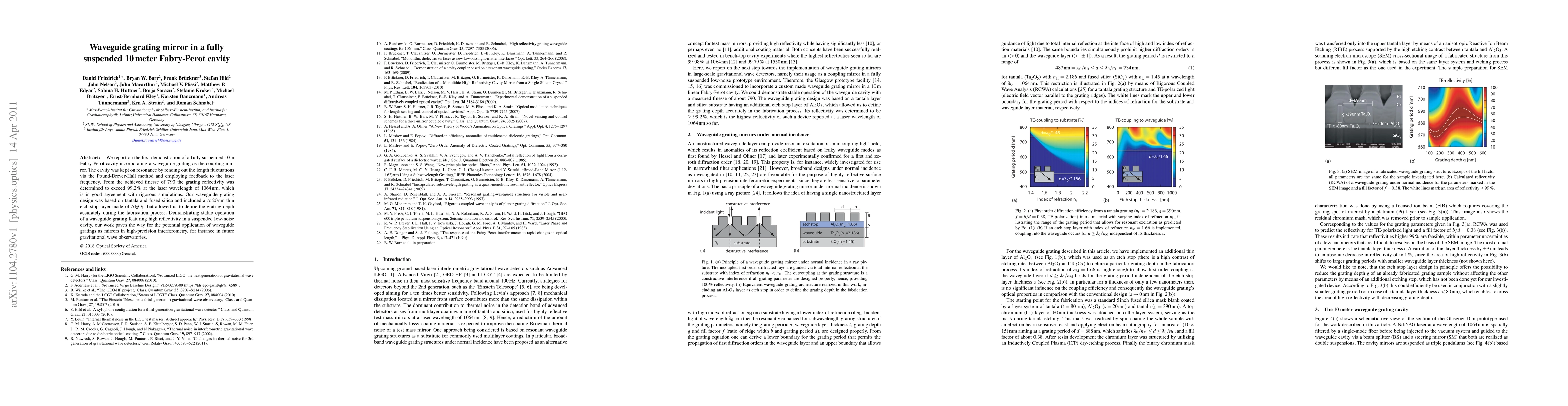 This paper demonstrates a fully suspended 10-meter Fabry-Perot cavity using a waveguide grating mirror with reflectivity exceeding 99.2% at 1064 nm. The cavity's stability and high finesse of 790 suggest its potential for high-precision interferometry, such as future gravitational wave detection.