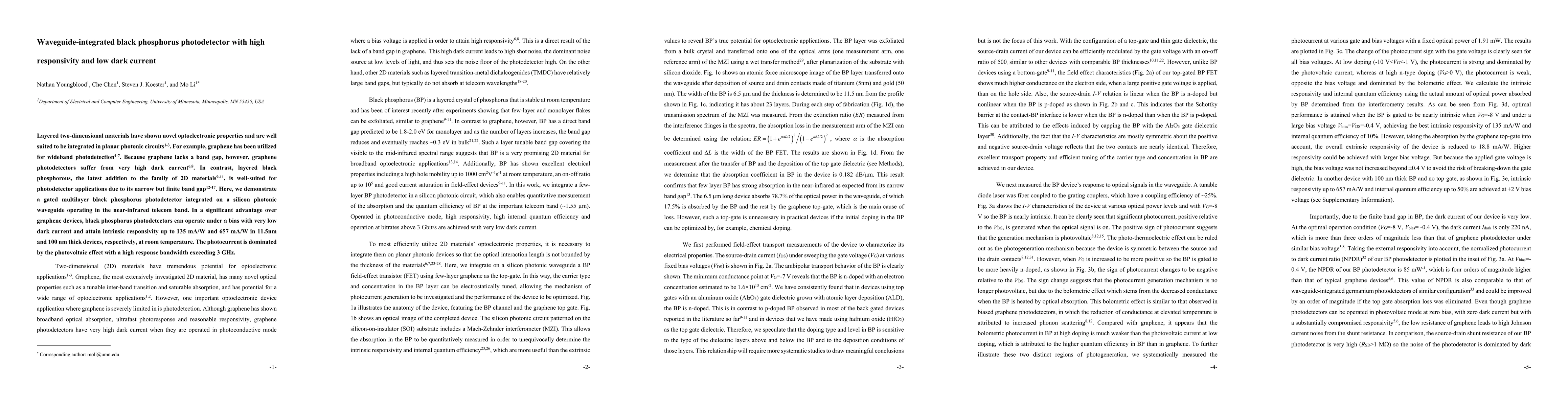 This paper presents a waveguide-integrated black phosphorus photodetector with high responsivity and low dark current, demonstrating significant advantages over graphene-based devices due to black phosphorus's intrinsic band gap, achieving responsivities up to 657 mA/W and operating with minimal dark current.