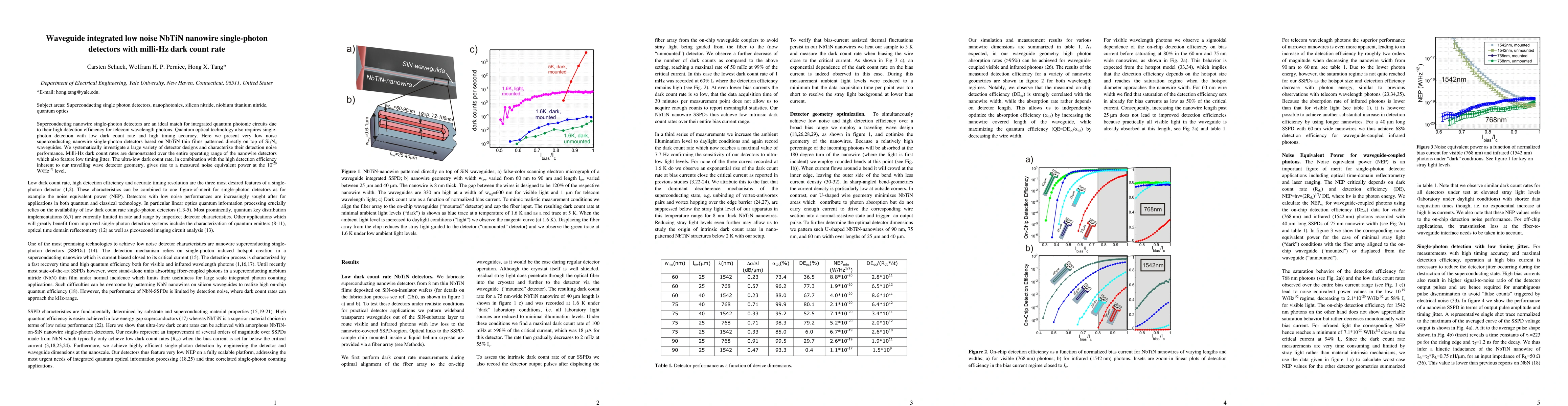 This paper presents NbTiN nanowire single-photon detectors integrated with Si3N4 waveguides, achieving milli-Hz dark count rates and low timing jitter, suitable for quantum photonic circuits. The detectors exhibit a noise equivalent power of 10^(-20) W/Hz^(1/2), demonstrating high detection efficiency and low noise.