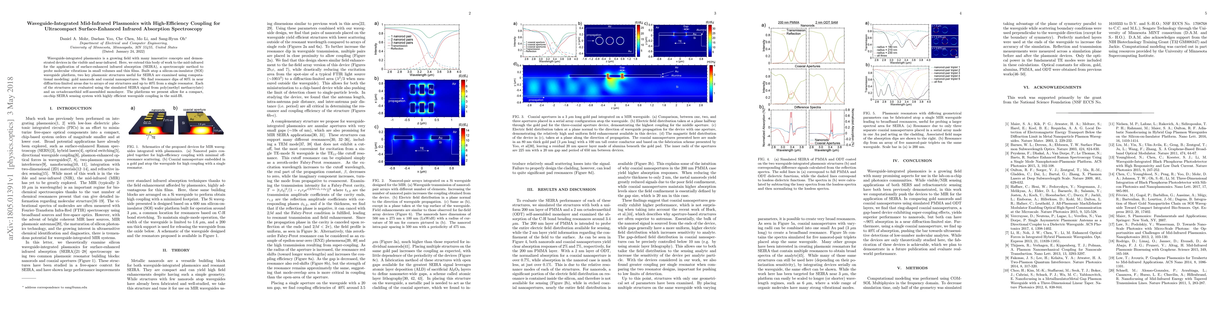 This paper explores waveguide-integrated mid-infrared plasmonics for ultracompact surface-enhanced infrared absorption spectroscopy, demonstrating high-efficiency coupling using gold nanorods and coaxial nanoapertures on a silicon-on-insulator platform. The study shows significant resonance dips and efficient SEIRA signal enhancement, enabling a compact on-chip sensing system.