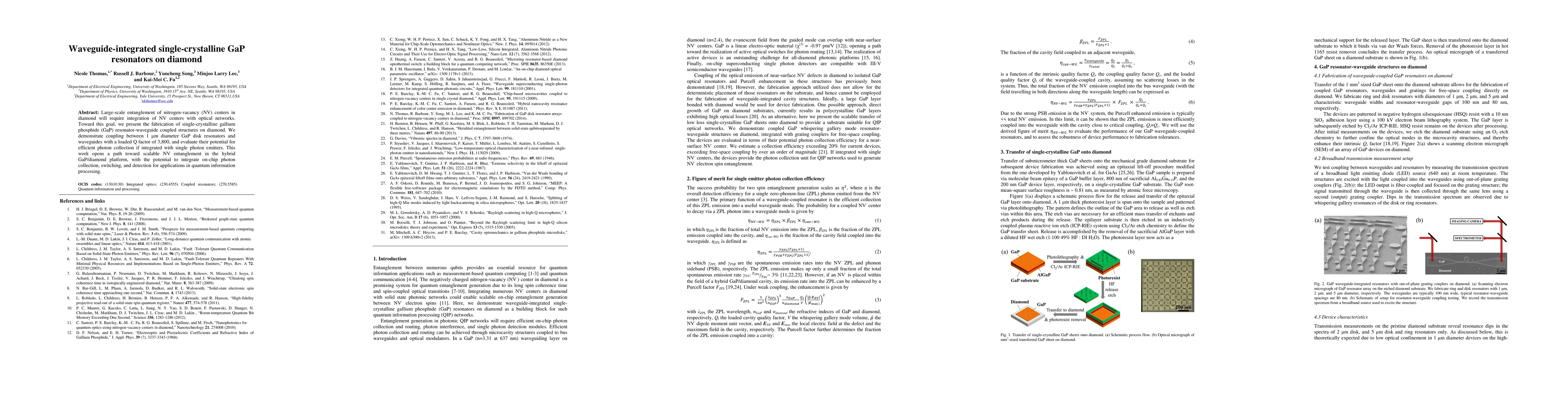 The paper describes the fabrication of single-crystalline GaP resonator-waveguide structures on diamond and demonstrates their efficient photon collection capabilities, achieving a loaded Q factor of 3,800, thus paving the way for scalable nitrogen-vacancy center entanglement and integrated quantum information processing.