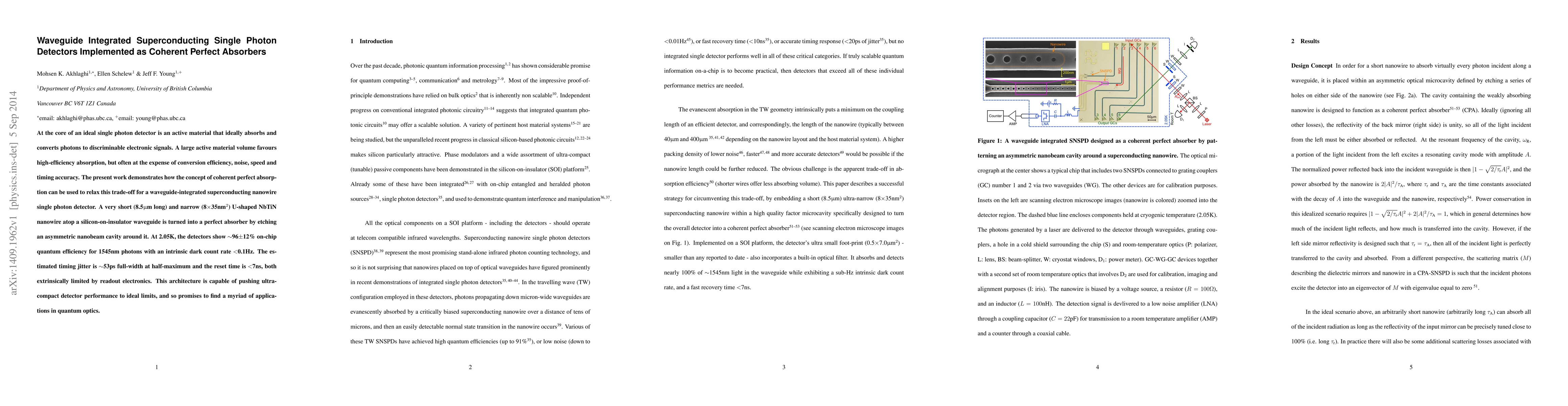At the core of an ideal single photon detector is an active material that ideally absorbs and converts photons to discriminable electronic signals. A large active material volume favours high-efficiency absorption, but often at the expense of conversion efficiency, noise, speed and timing accuracy. The present work demonstrates how the concept of coherent perfect absorption can be used to relax this trade-off for a waveguide-integrated superconducting nanowire single photon detector. A very short (8.5$\mu$m long) and narrow (8$\times$35nm$^2$) U-shaped NbTiN nanowire atop a silicon-on-insulator waveguide is turned into a perfect absorber by etching an asymmetric nanobeam cavity around it. At 2.05K, the detectors show $\sim$96$\pm$12% on-chip quantum efficiency for 1545nm photons with an intrinsic dark count rate $<$0.1Hz. The estimated timing jitter is $\sim$53ps full-width at half-maximum and the reset time is $<$7ns, both extrinsically limited by readout electronics. This architecture is capable of pushing ultra-compact detector performance to ideal limits, and so promises to find a myriad of applications in quantum optics.