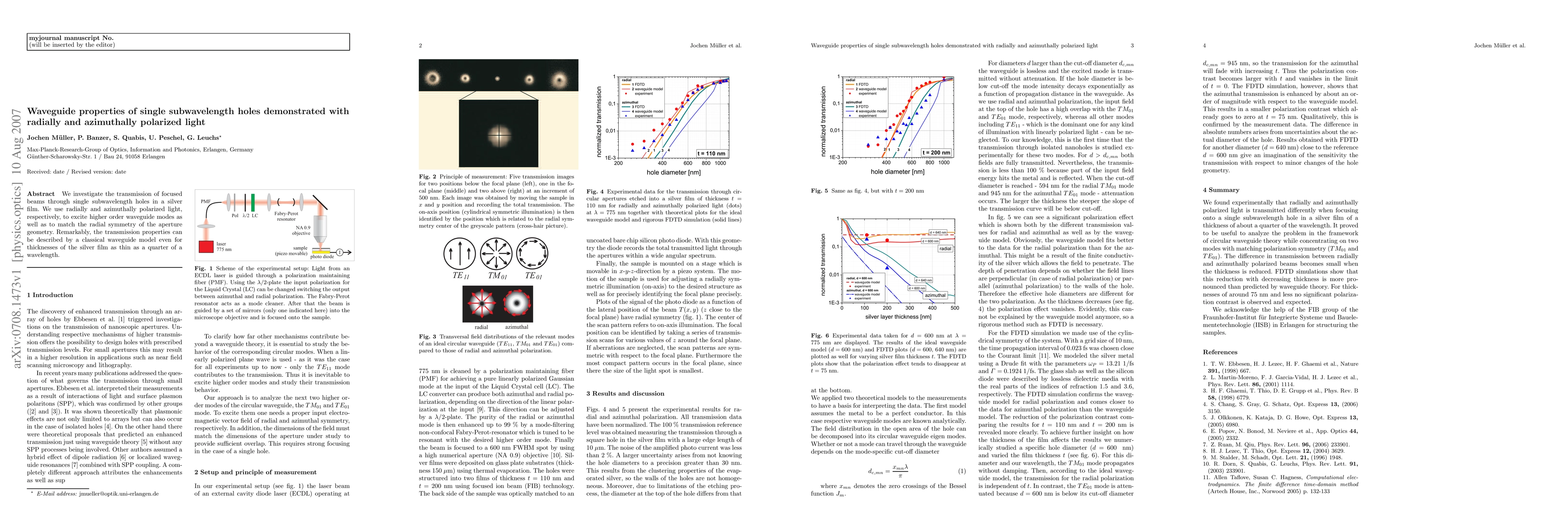 This study explores the waveguide properties of single subwavelength holes in a silver film using radially and azimuthally polarized light, revealing that transmission can be modeled classically despite the film's thickness being only a quarter of a wavelength. The different polarizations excite higher-order waveguide modes and match the aperture's radial symmetry.