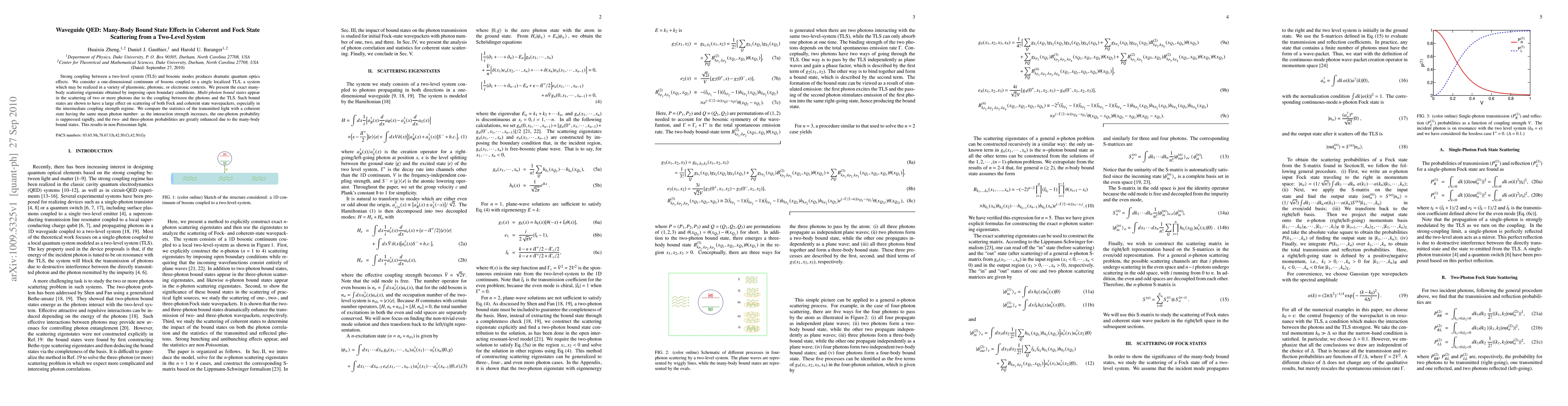 Strong coupling between a two-level system (TLS) and bosonic modes produces dramatic quantum optics effects. We consider a one-dimensional continuum of bosons coupled to a single localized TLS, a system which may be realized in a variety of plasmonic, photonic, or electronic contexts. We present the exact many-body scattering eigenstate obtained by imposing open boundary conditions. Multi-photon bound states appear in the scattering of two or more photons due to the coupling between the photons and the TLS. Such bound states are shown to have a large effect on scattering of both Fock and coherent state wavepackets, especially in the intermediate coupling strength regime. We compare the statistics of the transmitted light with a coherent state having the same mean photon number: as the interaction strength increases, the one-photon probability is suppressed rapidly, and the two- and three-photon probabilities are greatly enhanced due to the many-body bound states. This results in non-Poissonian light.