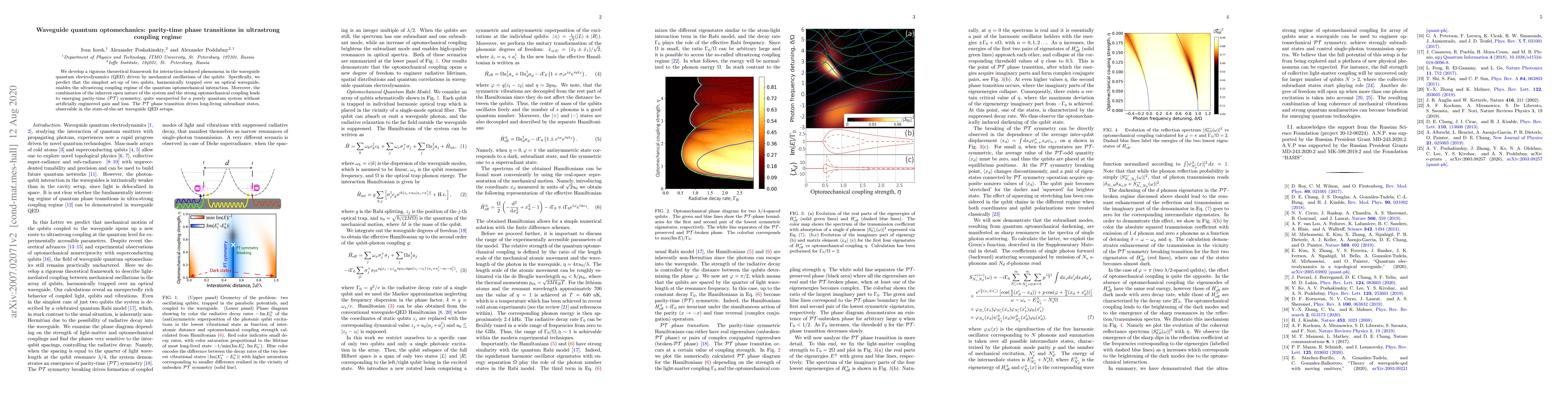This paper develops a theoretical framework for waveguide quantum optomechanics, predicting ultrastrong coupling in a system of two qubits over an optical waveguide. It reveals unexpected parity-time symmetry and $\mathcal{PT}$ phase transitions, leading to long-living subradiant states in purely quantum systems.