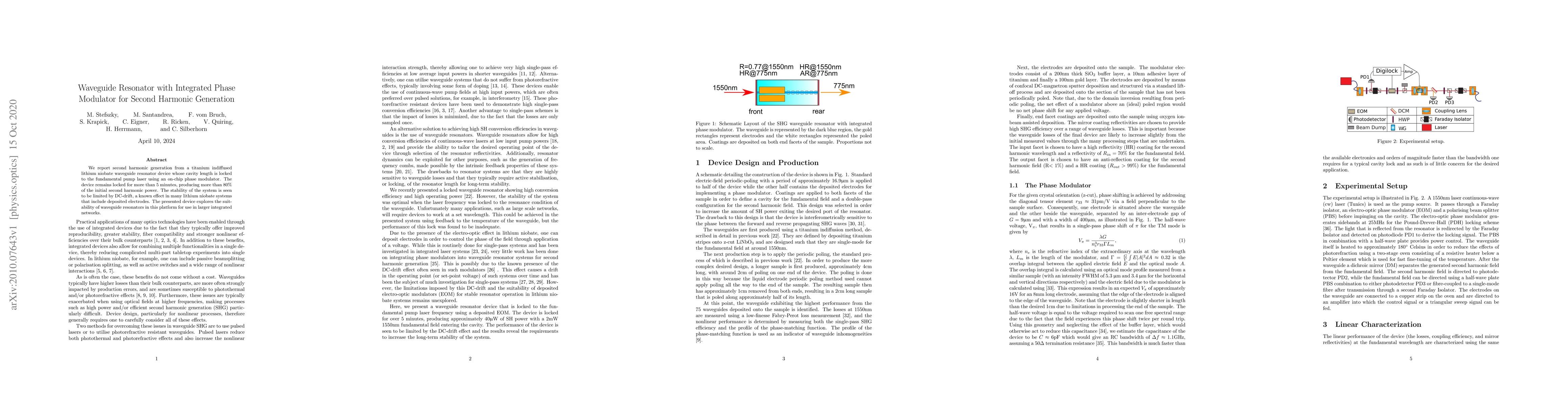 This paper describes a titanium-indiffused lithium niobate waveguide resonator with an integrated phase modulator, achieving stable second harmonic generation for over 5 minutes. The device's stability is limited by DC-drift, but it demonstrates the potential of waveguide resonators for use in integrated optical networks.