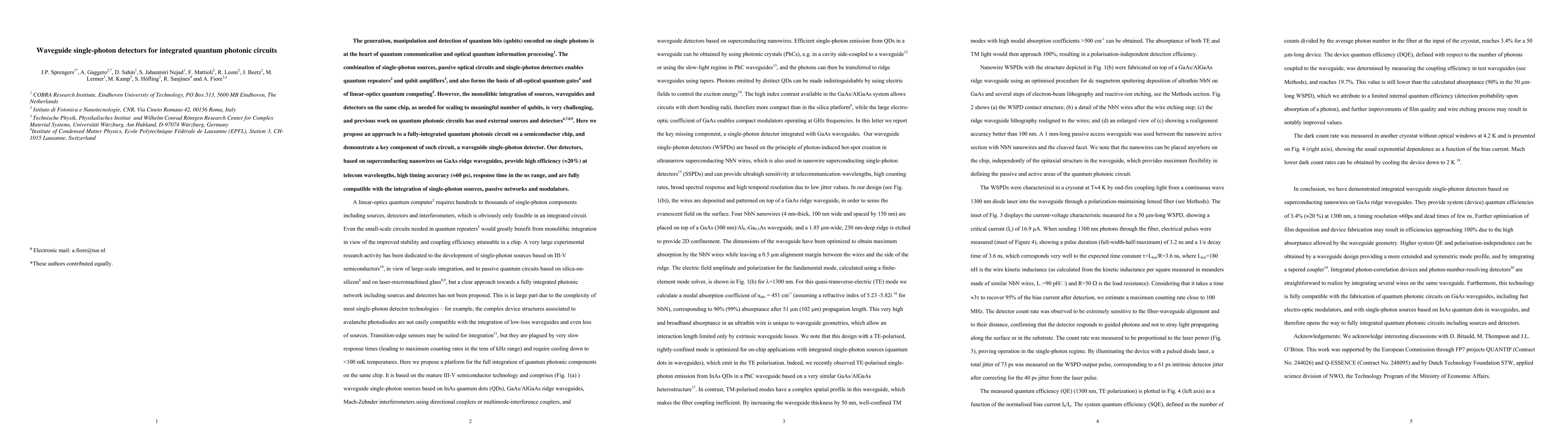 This paper proposes a fully integrated quantum photonic circuit on a semiconductor chip, focusing on a waveguide single-photon detector based on superconducting nanowires. The detectors exhibit 20% efficiency, 60 ps timing accuracy, and compatibility with other quantum components for scalable quantum communication and computing.