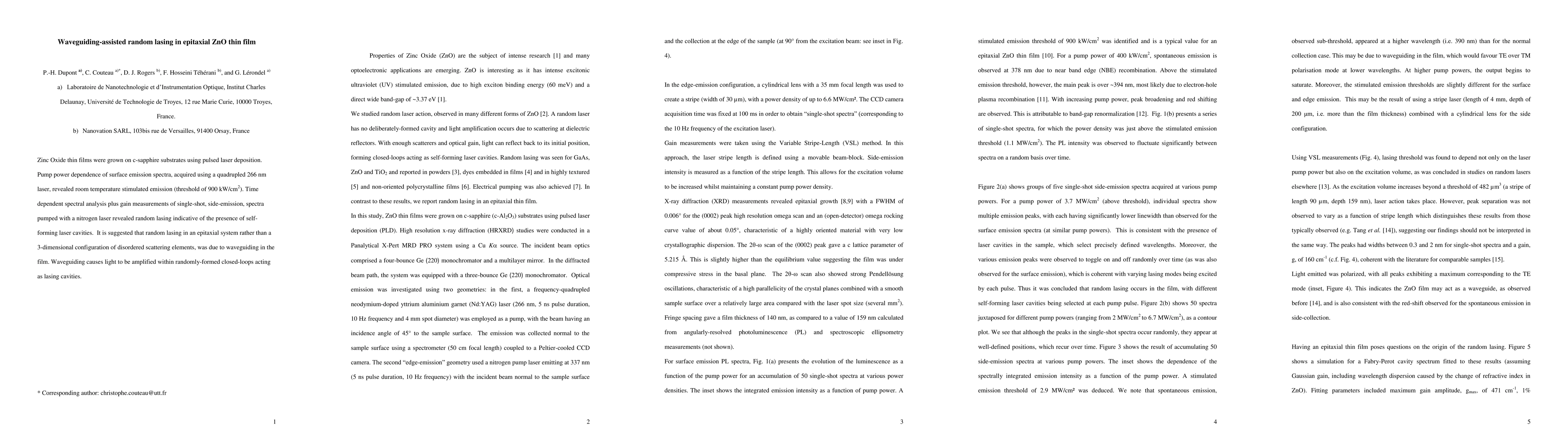 This study demonstrates waveguiding-assisted random lasing in epitaxial ZnO thin films grown on c-sapphire substrates via pulsed laser deposition. The research reveals room temperature stimulated emission and identifies self-forming laser cavities due to waveguiding, rather than traditional 3D scattering, leading to amplified light in closed-loop lasing cavities.