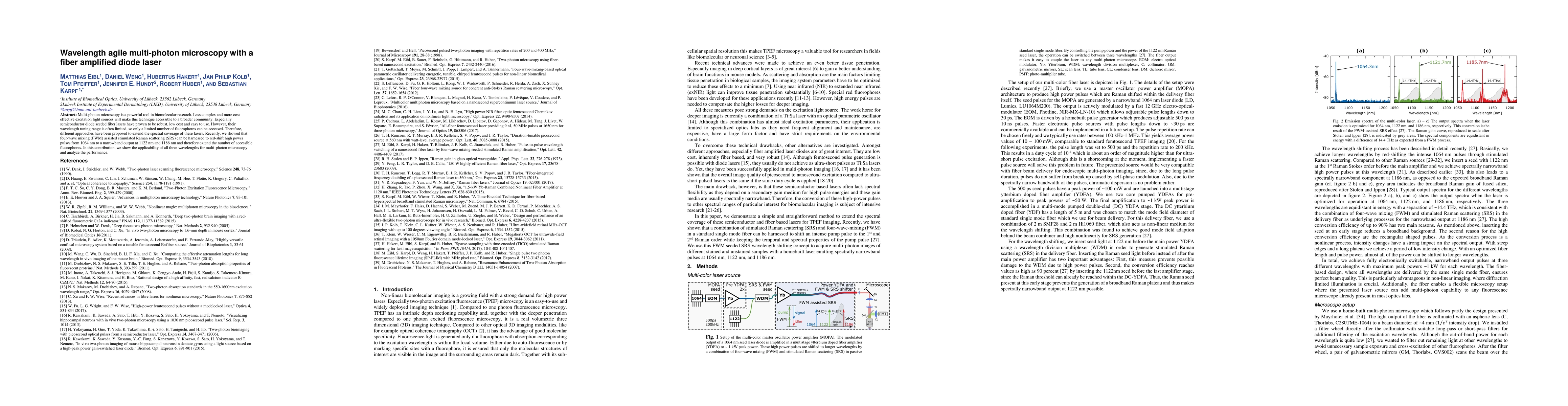 This paper demonstrates a wavelength-agile multi-photon microscopy system using a fiber amplified diode laser enhanced by four-wave mixing and stimulated Raman scattering to extend its spectral range. The study evaluates the performance of the system at three new wavelengths, broadening the accessible fluorophores for biomolecular research.