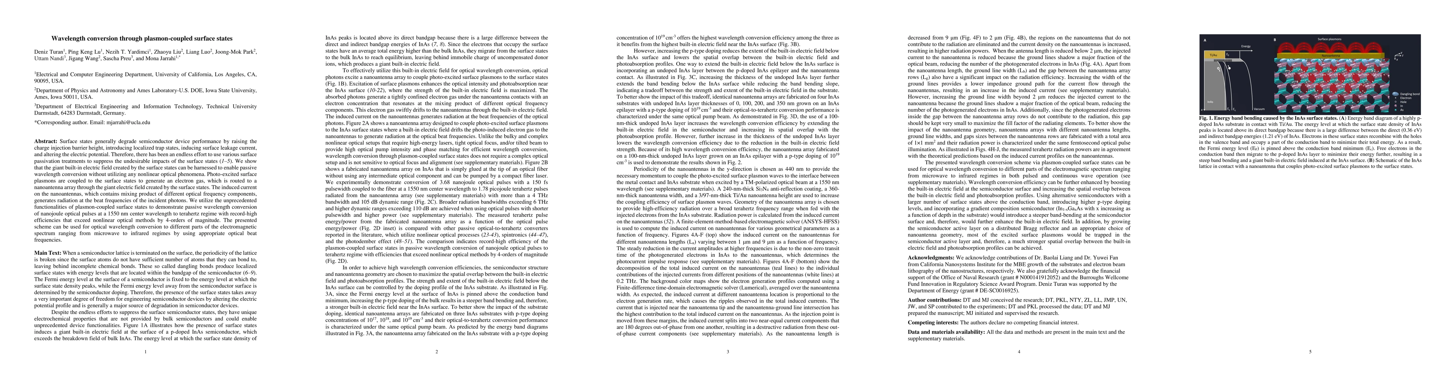 This paper demonstrates passive wavelength conversion using plasmon-coupled surface states, harnessing the giant built-in electric field to route photo-excited surface plasmons to nanoantennas, achieving record-high efficiency terahertz conversion of nanojoule pulses at 1550 nm. The method shows potential for broad electromagnetic spectrum conversion.