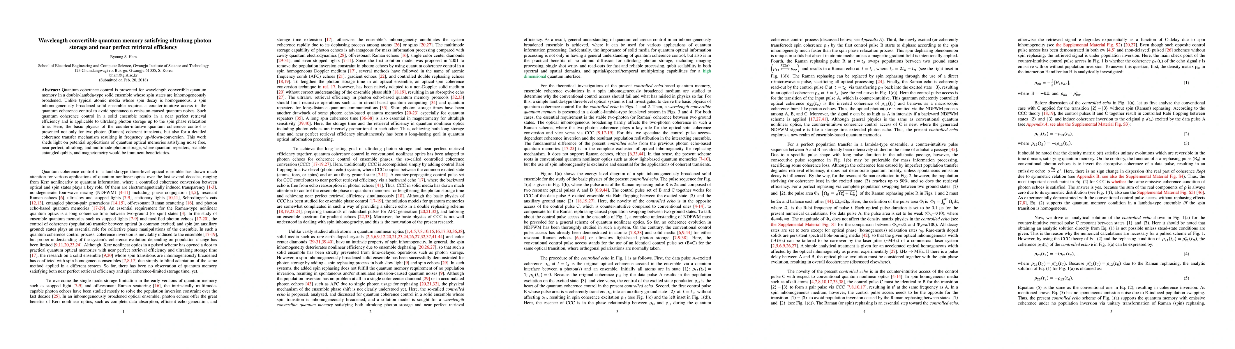 This paper presents a wavelength convertible quantum memory in a double-lambda-type solid ensemble, achieving ultralong photon storage and near perfect retrieval efficiency through counter-intuitive quantum coherence control. The method avoids spontaneous emission-induced quantum noise, enabling potential applications in quantum repeaters and scalable entangled qubits.