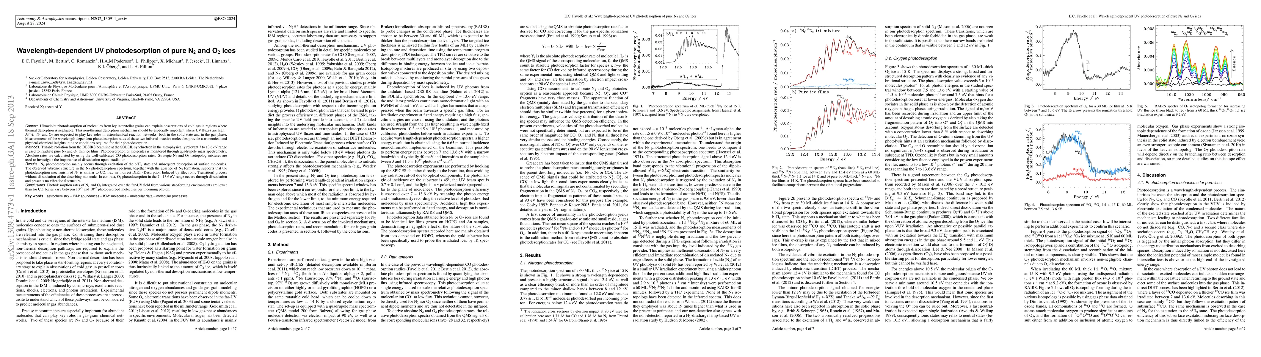 This study investigates the wavelength-dependent UV photodesorption of pure N2 and O2 ices, revealing distinct mechanisms: N2 desorption via an indirect DIET process without dissociation, while O2 desorption occurs through dissociation. Photodesorption rates are lower than for CO, ranging from 10E-3 to 10E-2 molecules per photon.