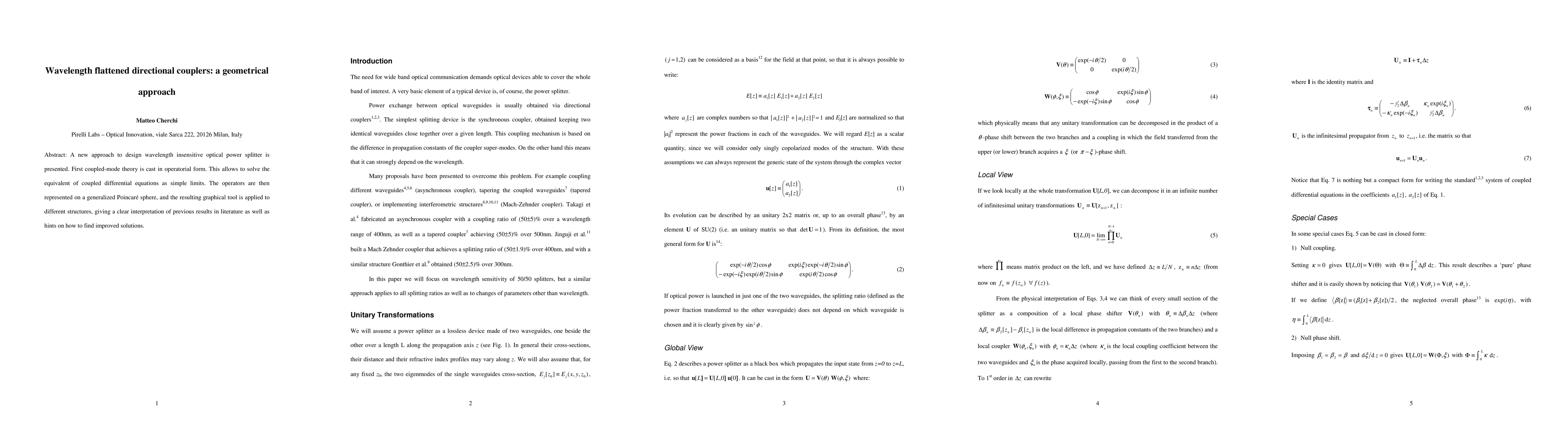 A new approach to design wavelength insensitive optical power splitter is presented. First coupled-mode theory is cast in operatorial form. This allows to solve the equivalent of coupled differential equations as simple limits. The operators are then represented on a generalized Poincare sphere, and the resulting graphical tool is applied to different structures, giving a clear interpretation of previous results in literature as well as hints on how to find improved solutions.