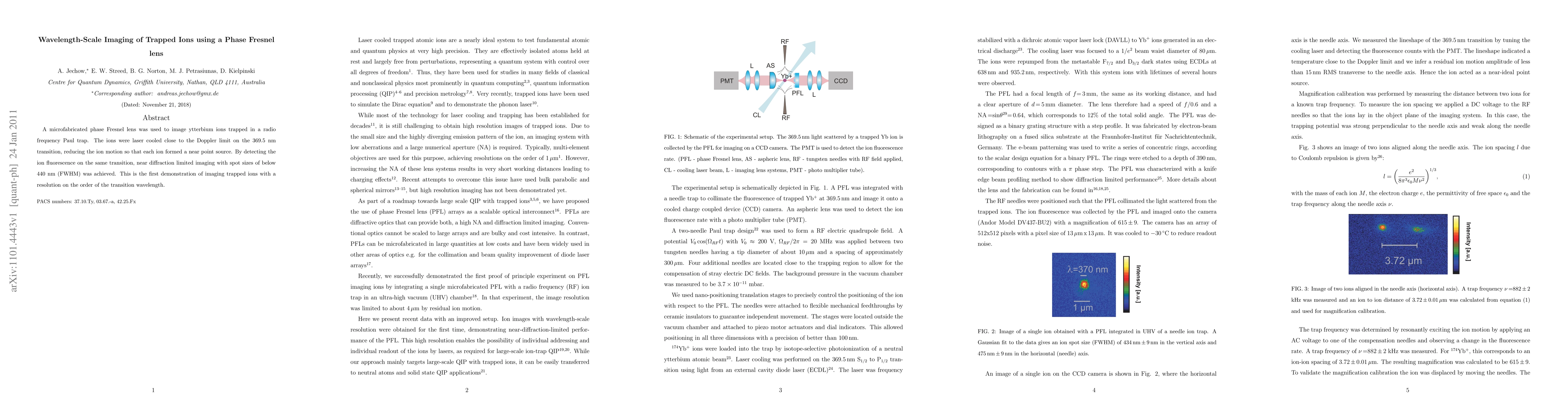 This paper demonstrates the use of a microfabricated phase Fresnel lens to achieve near diffraction-limited imaging of ytterbium ions trapped in a Paul trap, achieving spot sizes below 440 nm, marking the first wavelength-scale imaging of trapped ions.