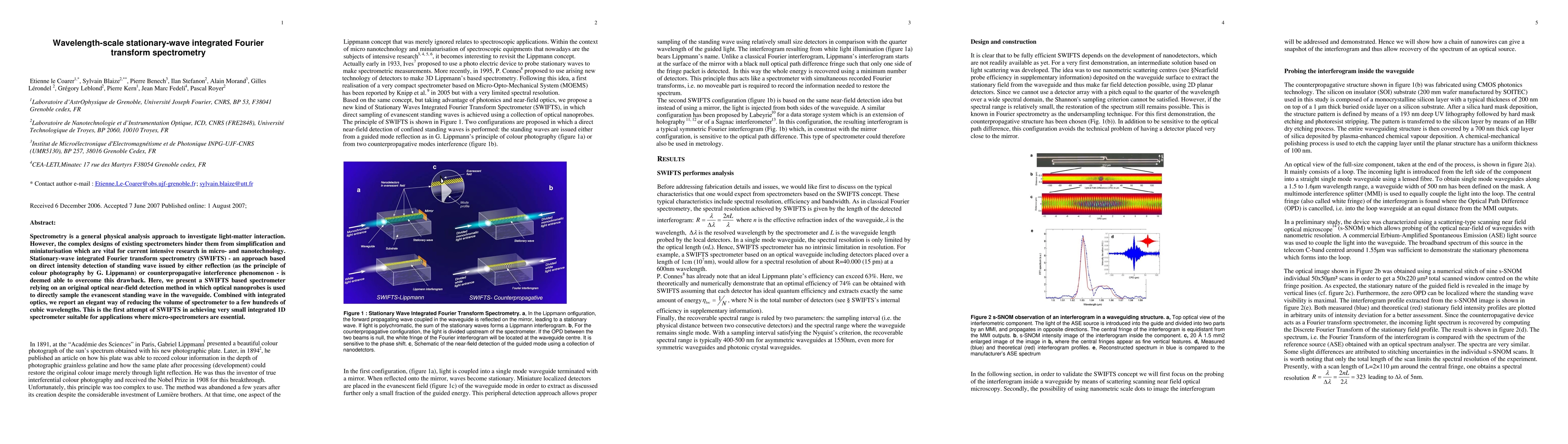 Spectrometry is a general physical-analysis approach for investigating light-matter interactions. However, the complex designs of existing spectrometers render them resistant to simplification and miniaturization, both of which are vital for applications in micro- and nanotechnology and which are now undergoing intensive research. Stationary-wave integrated Fourier-transform spectrometry (SWIFTS)-an approach based on direct intensity detection of a standing wave resulting from either reflection (as in the principle of colour photography by Gabriel Lippmann) or counterpropagative interference phenomenon-is expected to be able to overcome this drawback. Here, we present a SWIFTS-based spectrometer relying on an original optical near-field detection method in which optical nanoprobes are used to sample directly the evanescent standing wave in the waveguide. Combined with integrated optics, we report a way of reducing the volume of the spectrometer to a few hundreds of cubic wavelengths. This is the first attempt, using SWIFTS, to produce a very small integrated one-dimensional spectrometer suitable for applications where microspectrometers are essential.