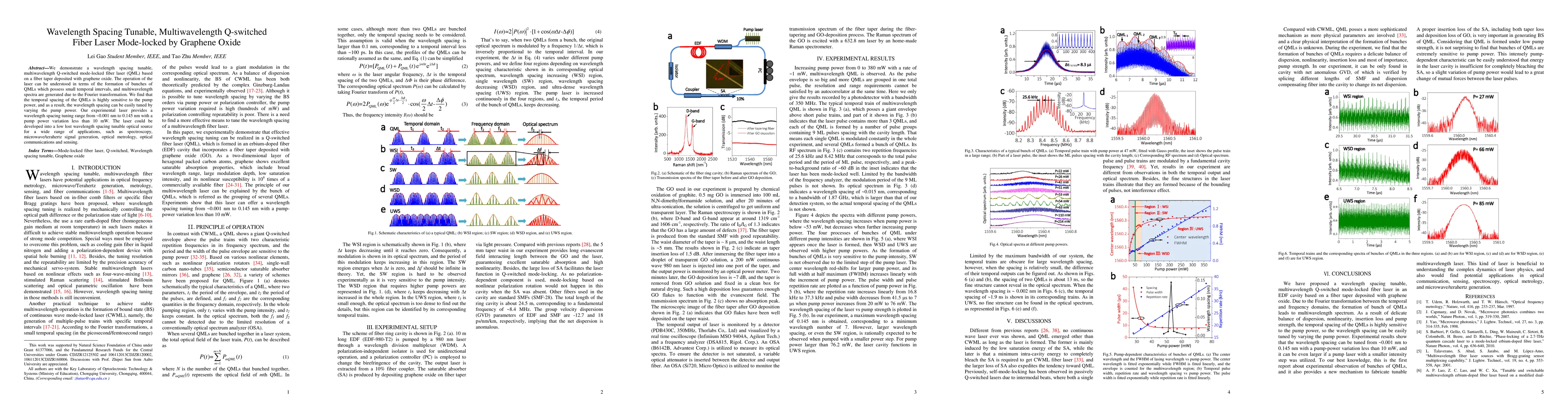 This research demonstrates a tunable, multiwavelength Q-switched mode-locked fiber laser using graphene oxide on a fiber taper, with a wavelength spacing tunable from ~0.001 nm to 0.145 nm by adjusting pump power. Potential applications include spectroscopy and optical communications.