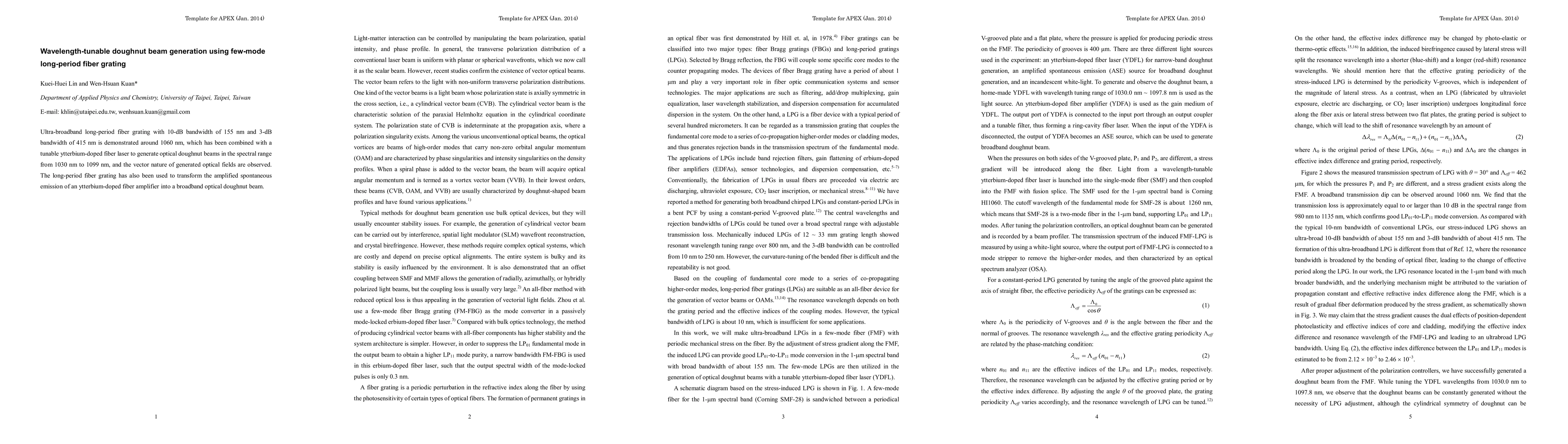 This paper demonstrates the generation of wavelength-tunable optical doughnut beams using a few-mode long-period fiber grating combined with a tunable ytterbium-doped fiber laser, achieving a spectral range from 1030 nm to 1099 nm. The vector nature of the generated optical fields is observed, and the grating also transforms amplified spontaneous emission into a broadband doughnut beam.