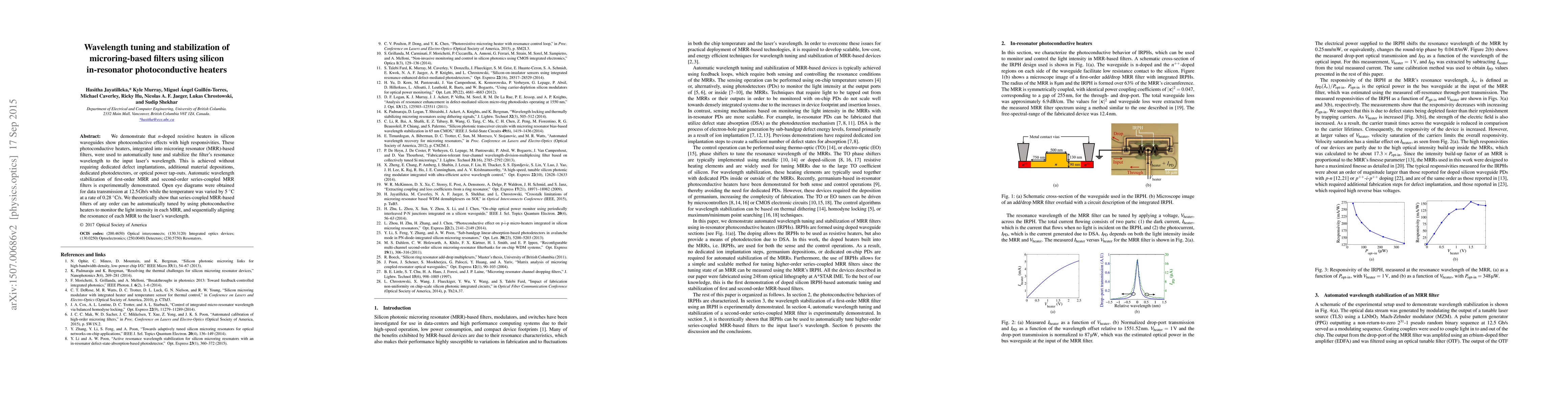 Researchers developed a method to tune and stabilize microring-based filters using photoconductive heaters in silicon waveguides, achieving automatic wavelength stabilization without additional components or defect implantations.