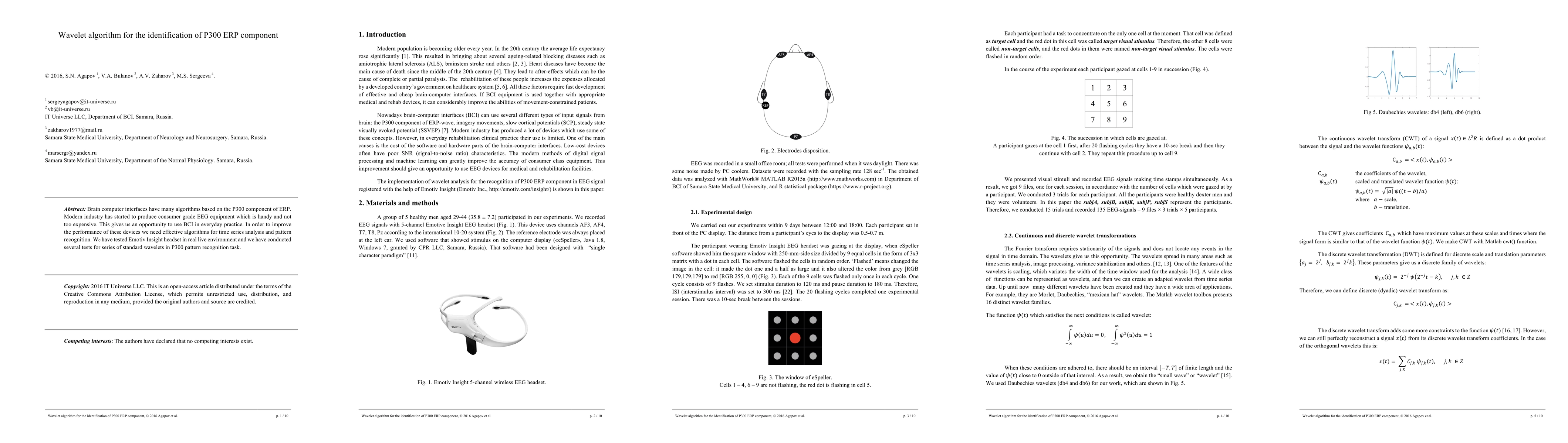 Brain-computer interfaces have many algorithms based on the P300 component of ERP. Modern industry has started to produce consumer grade EEG equipment which is handy and not too expensive. This gives us an opportunity to use BCI in everyday practice. In order to improve the performance of these devices, we need effective algorithms for time series analysis and pattern recognition. We have tested Emotiv Insight headset in a real live environment and we have conducted several tests for series of standard wavelets in P300 pattern recognition task.