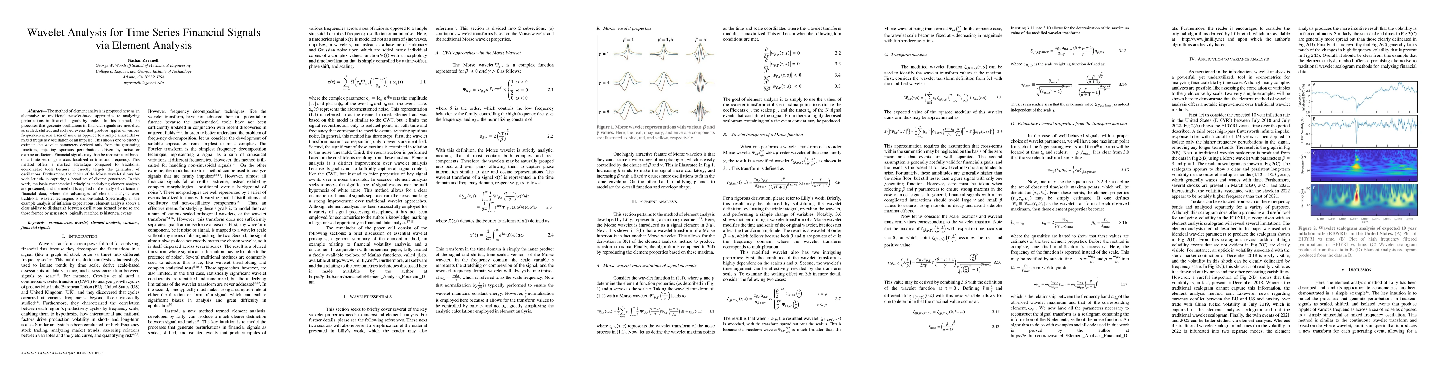 Element analysis offers a novel approach to wavelet-based time series analysis of financial signals by modeling oscillations as scaled, shifted, and isolated events. This method effectively isolates true signal generators from noise, demonstrating superior performance in distinguishing meaningful oscillations from spurious ones, as shown in the analysis of inflation expectations.