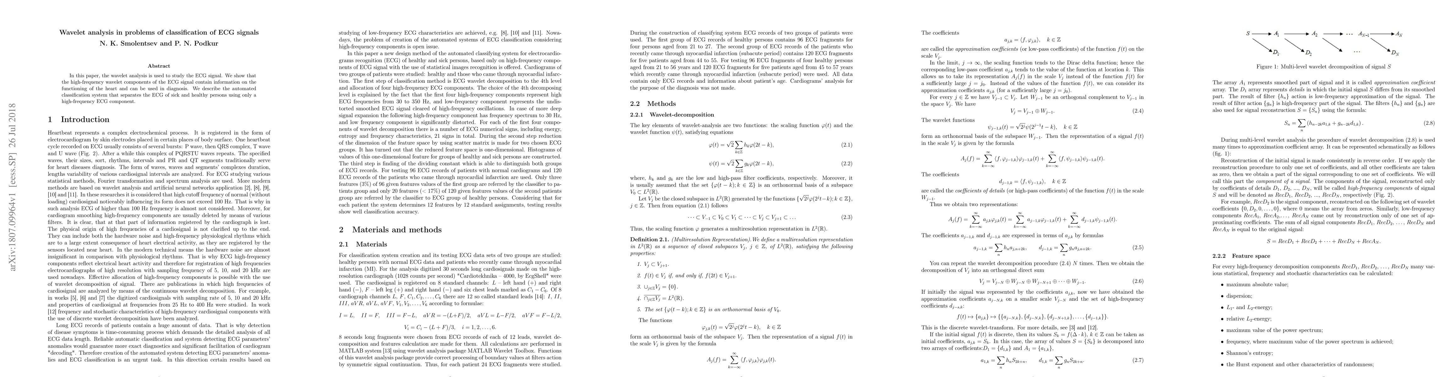 This paper utilizes wavelet analysis to classify ECG signals, demonstrating that high-frequency components hold diagnostic information for heart function. An automated system is developed to differentiate between healthy and sick individuals based on these high-frequency ECG features.