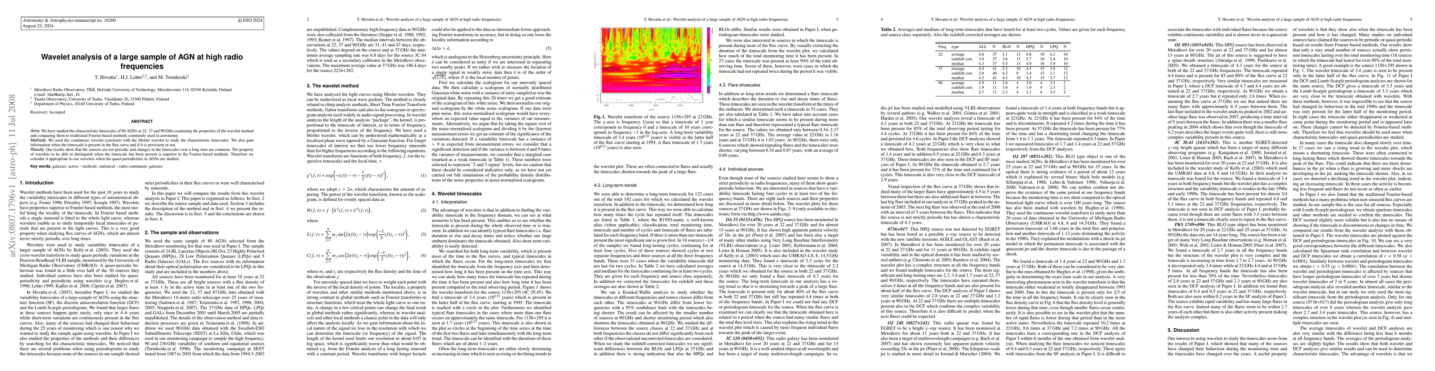 We have studied the characteristic timescales of 80 AGNs at 22, 37 and 90 GHz examining the properties of the wavelet method and comparing them to traditional Fourier-based methods commonly used in astronomy. We used the continuous wavelet transform with the Morlet wavelet to study the characteristic timescales. We also gain information when the timescale is present in the flux curve and if it is persistent or not. Our results show that the sources are not periodic and changes in the timescales over a long time are common. The property of wavelets to be able to distinguish when the timescale has been present is superior to the Fourier-based methods. Therefore we consider it appropriate to use wavelets when the quasi-periodicities in AGNs are studied.