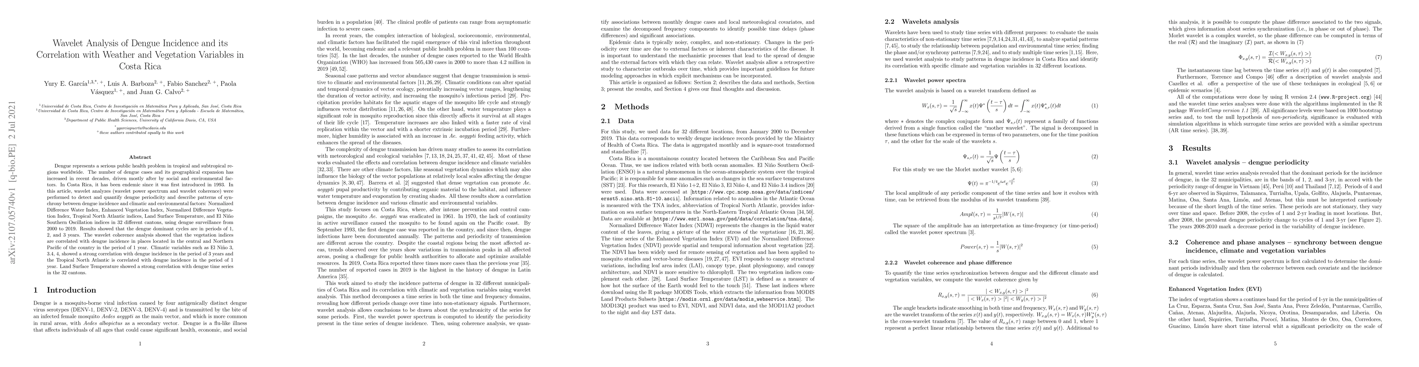 This study uses wavelet analysis to identify periodic patterns in dengue incidence in Costa Rica from 2000 to 2019 and correlate them with climatic and vegetation variables. Results indicate dominant dengue cycles of 1, 2, and 3 years, with significant correlations between vegetation and climatic indices, particularly in central and northern regions.