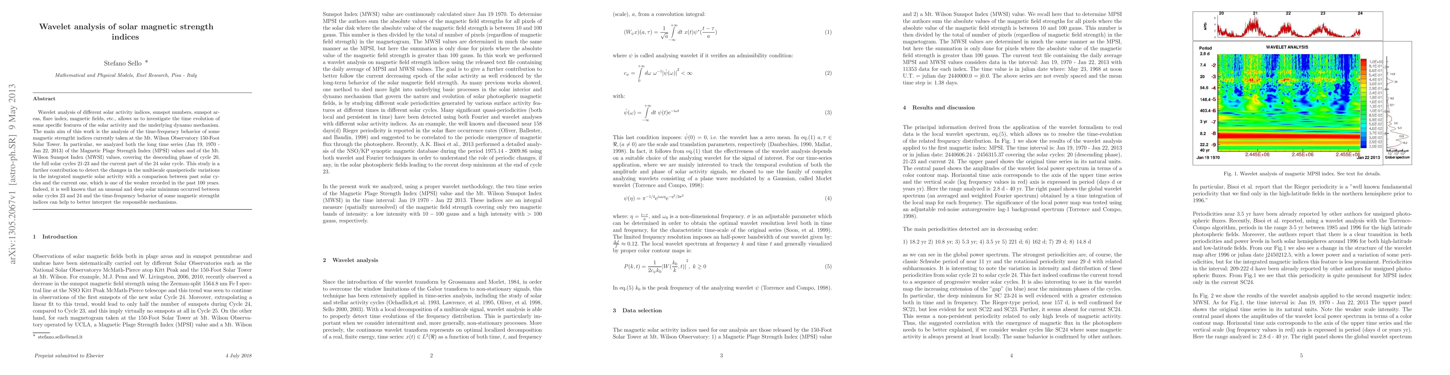 Wavelet analysis of different solar activity indices, sunspot numbers, sunspot areas, flare index, magnetic fields, etc., allows us to investigate the time evolution of some specific features of the solar activity and the underlying dynamo mechanism. The main aim of this work is the analysis of the time-frequency behavior of some magnetic strengtht indices currently taken at the Mt. Wilson Observatory 150-Foot Solar Tower. In particular, we analyzed both the long time series (Jan 19, 1970 - Jan 22, 2013) of the Magnetic Plage Strength Index (MPSI) values and of the Mt. Wilson Sunspot Index (MWSI) values, covering the descending phase of cycle 20, the full solar cycles 21-23 and the current part of the 24 solar cycle. This study is a further contribution to detect the changes in the multiscale quasiperiodic variations in the integrated magnetic solar activity with a comparison between past solar cycles and the current one, which is one of the weaker recorded in the past 100 years. Indeed, it is well known that an unusual and deep solar minimum occurred between solar cycles 23 and 24 and the time-frequency behavior of some magnetic strengtht indices can help to better interpret the responsible mechanisms.