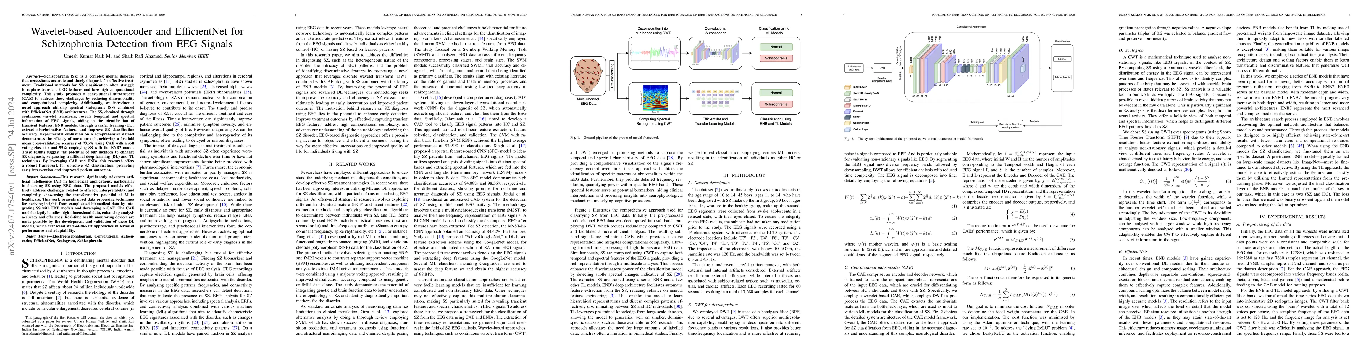 This study proposes a wavelet-based convolutional autoencoder (CAE) and EfficientNet (ENB) model for accurate schizophrenia detection from EEG signals, achieving 98.5% accuracy with CAE and 99% with ENB, demonstrating improved classification over traditional deep learning methods.