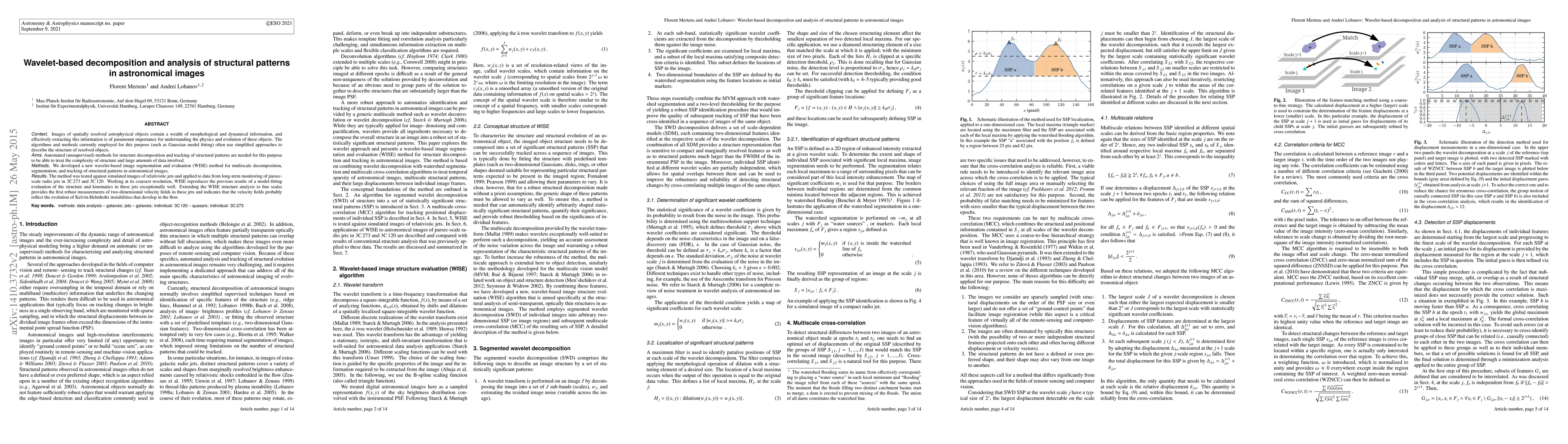 Context. Images of spatially resolved astrophysical objects contain a wealth of morphological and dynamical information, and effective extraction of this information is of paramount importance for understanding the physics and evolution of these objects. Algorithms and methods employed presently for this purpose (such as, for instance, Gaussian model fitting) often use simplified approaches for describing the structure of resolved objects. Aims. Automated (unsupervised) methods for structure decomposition and tracking of structural patterns are needed for this purpose, in order to be able to deal with the complexity of structure and large amount of data involved. Methods. A new Wavelet-based Image Segmentation and Evaluation (WISE) method is developed for multiscale decomposition, segmentation, and tracking of structural patterns in astronomical images. Results. The method is tested against simulated images of relativistic jets and applied to data from long-term monitoring of parsec- scale radio jets in 3C 273 and 3C 120. Working at its coarsest resolution, WISE reproduces exceptionally well the previous results of model fitting evaluation of the structure and kinematics in these jets. Extending the WISE structure analysis to the finer scales provides the first robust measurements of two-dimensional velocity fields in these jets and indicates that the velocity fields are likely to reflect the evolution of Kelvin-Hemlholtz instability developing the flow.