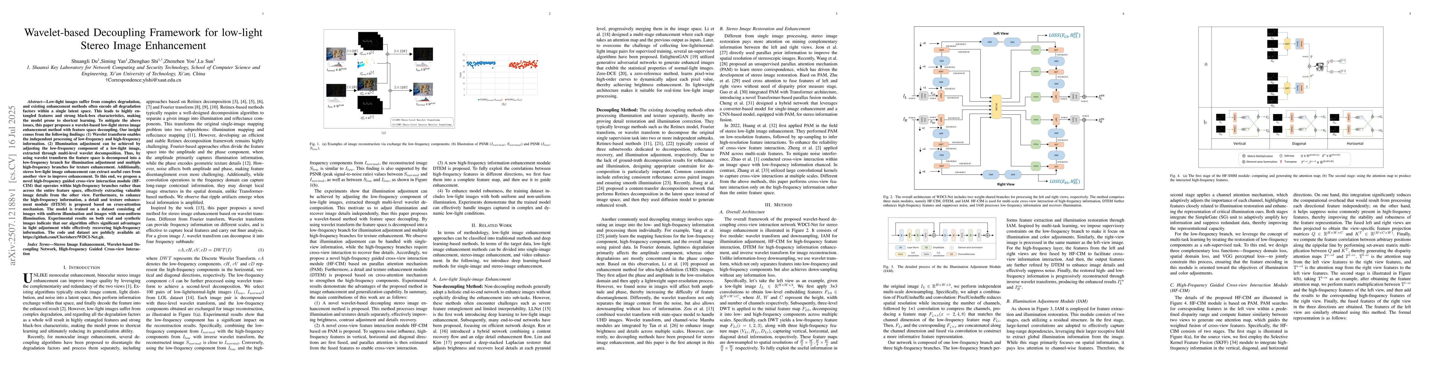 Low-light images suffer from complex degradation, and existing enhancement methods often encode all degradation factors within a single latent space. This leads to highly entangled features and strong black-box characteristics, making the model prone to shortcut learning. To mitigate the above issues, this paper proposes a wavelet-based low-light stereo image enhancement method with feature space decoupling. Our insight comes from the following findings: (1) Wavelet transform enables the independent processing of low-frequency and high-frequency information. (2) Illumination adjustment can be achieved by adjusting the low-frequency component of a low-light image, extracted through multi-level wavelet decomposition. Thus, by using wavelet transform the feature space is decomposed into a low-frequency branch for illumination adjustment and multiple high-frequency branches for texture enhancement. Additionally, stereo low-light image enhancement can extract useful cues from another view to improve enhancement. To this end, we propose a novel high-frequency guided cross-view interaction module (HF-CIM) that operates within high-frequency branches rather than across the entire feature space, effectively extracting valuable image details from the other view. Furthermore, to enhance the high-frequency information, a detail and texture enhancement module (DTEM) is proposed based on cross-attention mechanism. The model is trained on a dataset consisting of images with uniform illumination and images with non-uniform illumination. Experimental results on both real and synthetic images indicate that our algorithm offers significant advantages in light adjustment while effectively recovering high-frequency information. The code and dataset are publicly available at: https://github.com/Cherisherr/WDCI-Net.git.