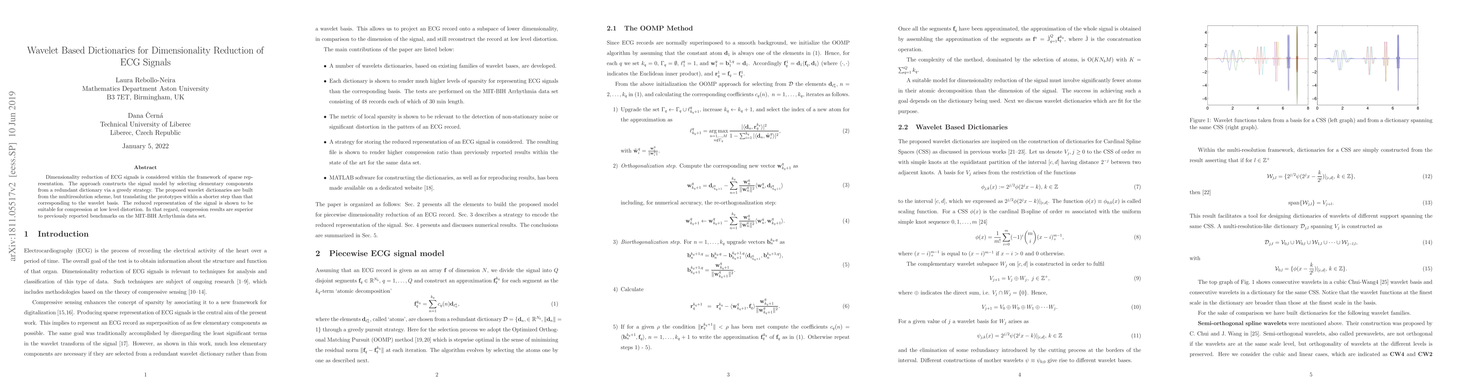 This paper proposes a method for reducing the dimensionality of ECG signals using wavelet-based dictionaries, achieving better compression results than previous benchmarks.
