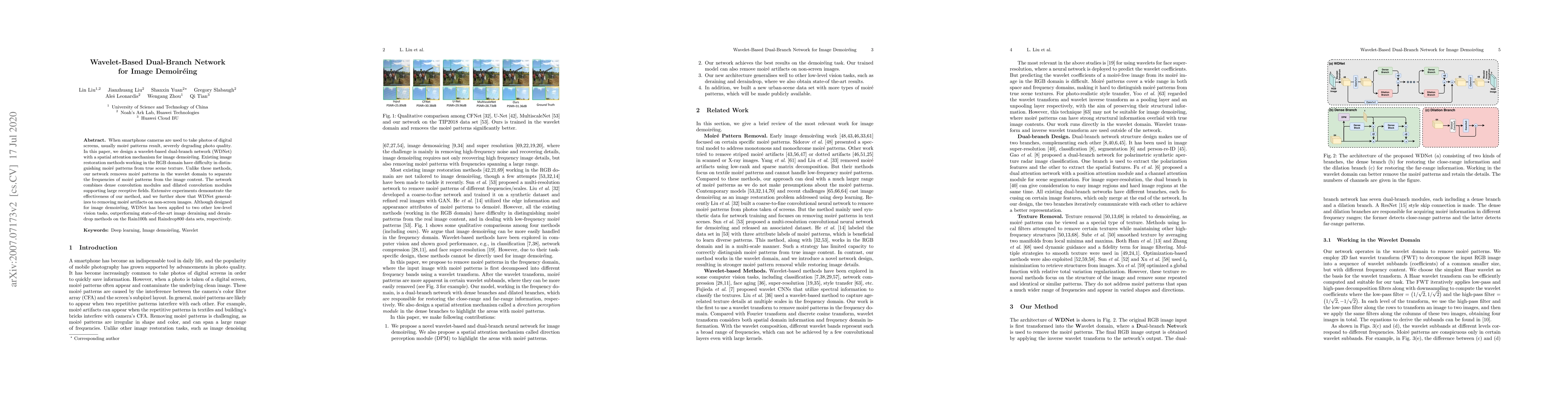 This paper proposes a wavelet-based dual-branch network (WDNet) for removing moire patterns from smartphone photos of digital screens, utilizing a spatial attention mechanism and working in the wavelet domain to better separate moire frequencies from image content. The network's effectiveness is demonstrated through extensive experiments, showing it also performs well on other low-level vision tasks like deraining.