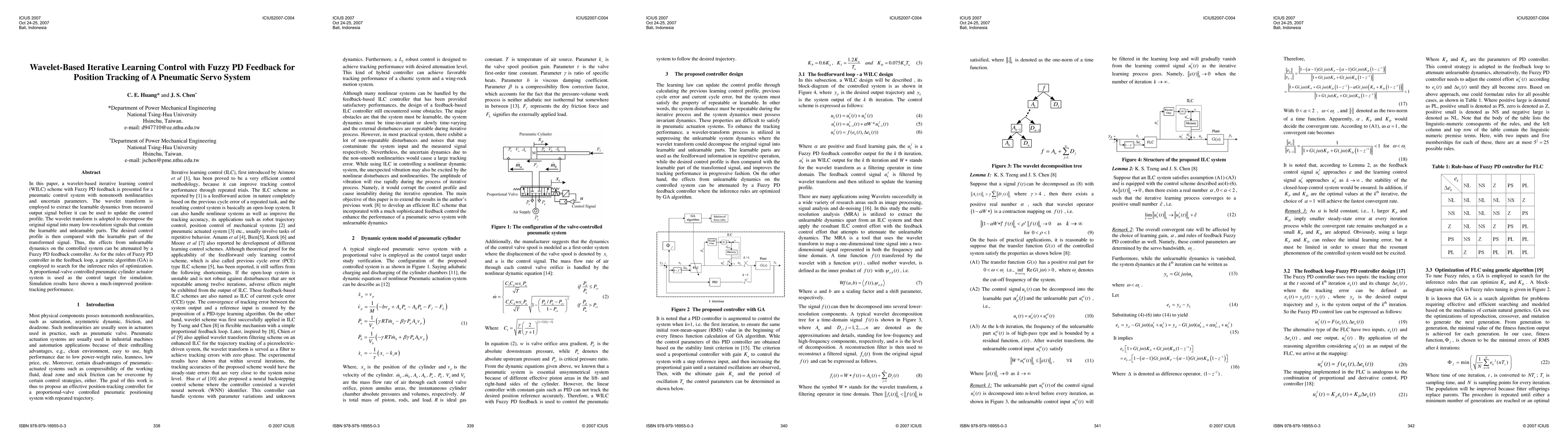 In this paper, a wavelet-based iterative learning control (WILC) scheme with Fuzzy PD feedback is presented for a pneumatic control system with nonsmooth nonlinearities and uncertain parameters. The wavelet transform is employed to extract the learnable dynamics from measured output signal before it can be used to update the control profile. The wavelet transform is adopted to decompose the original signal into many low-resolution signals that contain the learnable and unlearnable parts. The desired control profile is then compared with the learnable part of the transformed signal. Thus, the effects from unlearnable dynamics on the controlled system can be attenuated by a Fuzzy PD feedback controller. As for the rules of Fuzzy PD controller in the feedback loop, a genetic algorithm (GA) is employed to search for the inference rules of optimization. A proportional-valve controlled pneumatic cylinder actuator system is used as the control target for simulation. Simulation results have shown a much-improved positiontracking performance.